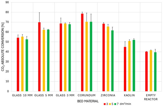 The comprehensive data on absolute conversion of CO2 (expressed in %) under various conditions were collected and are presented in Figure 4. These results represent the mean values and their standard deviations, calculated from repeated runs for each experimental condition.
