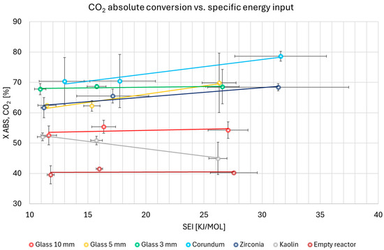 Figure 5 displays the dependence of the absolute conversion of CO2 on the specific energy input. The reported results are mean values, along with the standard deviations across repeated runs, obtained for the respective experimental conditions.