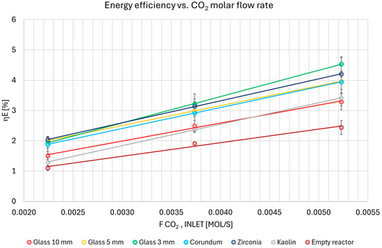 Figure 6 highlights how energy efficiency, expressed in [%], varies with the molar flow rate of CO2. The mean values for each test condition, together with their standard deviations, were computed based on the multiple runs performed. The limited magnitude of the standard deviation highlights the consistency of the results.