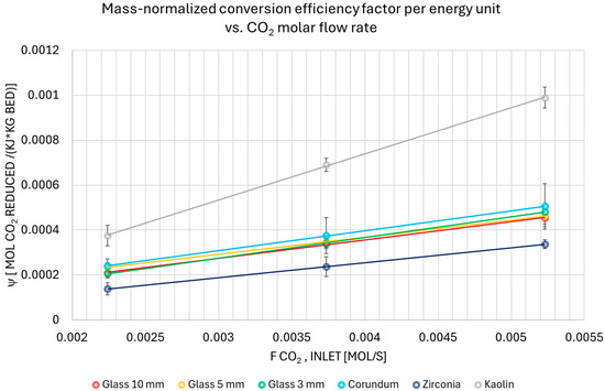 Figure 7 illustrates the impact of the molar CO2 flow rate on the mass-normalized conversion efficiency factor (Ψ), providing a clear comparison of the performance of different packing materials. For every experimental condition, the data points are shown as the mean value with the standard deviation derived from the repeated measurements. The data exhibited low variability (or low scatter), suggesting reliable measurements.