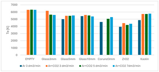 Figure 4 shows that the conversion efficiency of the packed-bed reactor in the ascending order is as follows: empty reactor < kaolin < 10 mm glass < 5 mm glass < zirconia < 3 mm glass < corundum. Increasing the gas flow rate decreases the SEI, resulting in lower CO2 conversion because less energy is supplied per mole of reactant to drive the reaction. Furthermore, a higher gas flow rate results in a shorter residence time in the reactor, ultimately reducing the number of molecular collisions with energetic electrons and, consequently, the rate of bond destruction [39]. However, this also results in lower concentrations of CO and O2, making the reverse reaction less probable. Overall, high flow rates are preferred for improving reactor throughput and reaction rate. A notable exception to the aforementioned conversion–flow rate dependence was kaolin. This material did not follow the observed behavior. For kaolin, the character of the plasma discharge in the inter-particle void spaces may be a crucial factor. This is attributed to the influence of increasing flow turbulence, which in turn promotes the carbon dioxide conversion process. Additionally, for the empty reactor, the gas flow rate had no significant effect on conversion. In the case of variants with beads and pellets, the positive contribution of the packing compensates for the lower residence time, resulting in higher conversion compared to the empty reactor. The obtained results demonstrated good consistency across repeated runs.