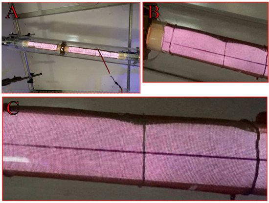 Exemplary imaging of plasma discharge in the empty DBD reactor (A); ((B,C) zoom).