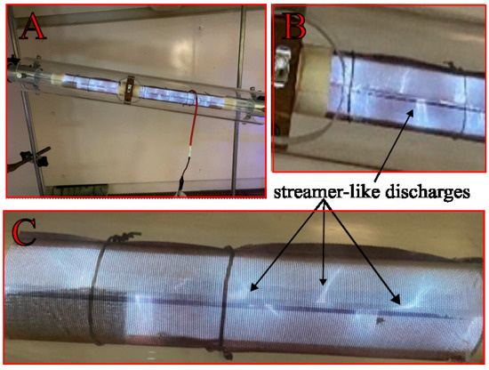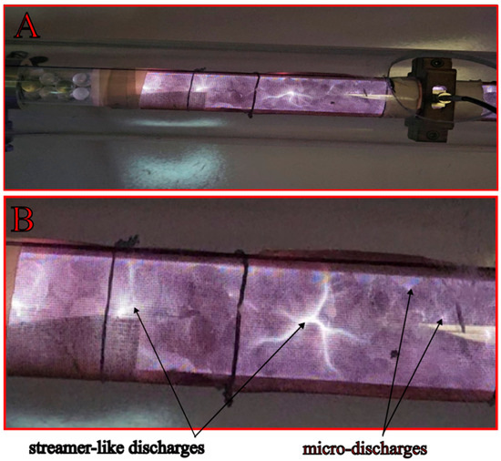 Images of the operating reactor were captured using an iPhone 14 digital camera (Apple Inc., Cupertino, CA, USA) camera to visualize the interaction between plasma and packing material and to provide a qualitative comparison of the modes of discharge propagation.