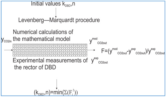 The mechanism of carbon dioxide decomposition during barrier discharges is not fully understood, so the mathematical model was based on two parameters: kDBD and n. The first parameter determines the rate constant of the CO2 decomposition reaction, and the second determines the exponential coefficient at the CO2 partial pressure. Both parameters characterize the production of carbon monoxide and oxygen during barrier discharges. The Levenberg–Marquardt algorithm, found in the lsqnonlin function available in the MATLAB R2024a package, was used to optimize the parameters in the kinetic model. The optimization procedure was based on relative error calculations using experimental measurements of carbon dioxide concentration at the reactor outlet and values obtained from numerical simulations performed in the MATLAB package. The ode15s procedure was used to integrate the system of ordinary differential equations (see the kinetic model). The procedure is presented in Figure 14. Using the lsqnonlin function, such parameters were sought in the kinetic model (see kDBD and n) to achieve the minimum sum of squared relative errors.