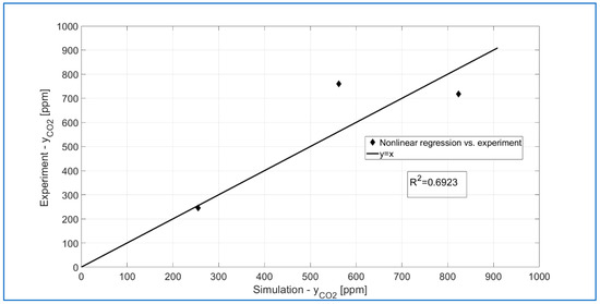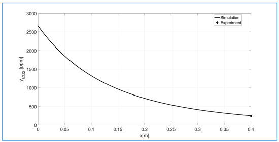 The results of the kDBD and n parameter optimization procedure are presented in Figure 16. As can be seen, the CO2 concentration values at the outlet obtained from the numerical simulations describe the experimental results quite well. However, it must be admitted that these are preliminary results, and work on a better kinetic model will continue. As a result of the performed procedure, a local minimum of the F function was obtained (see Figure 14) for kDBD = 0.0264 [mol s−1 bar−n] and n = 1.2004.