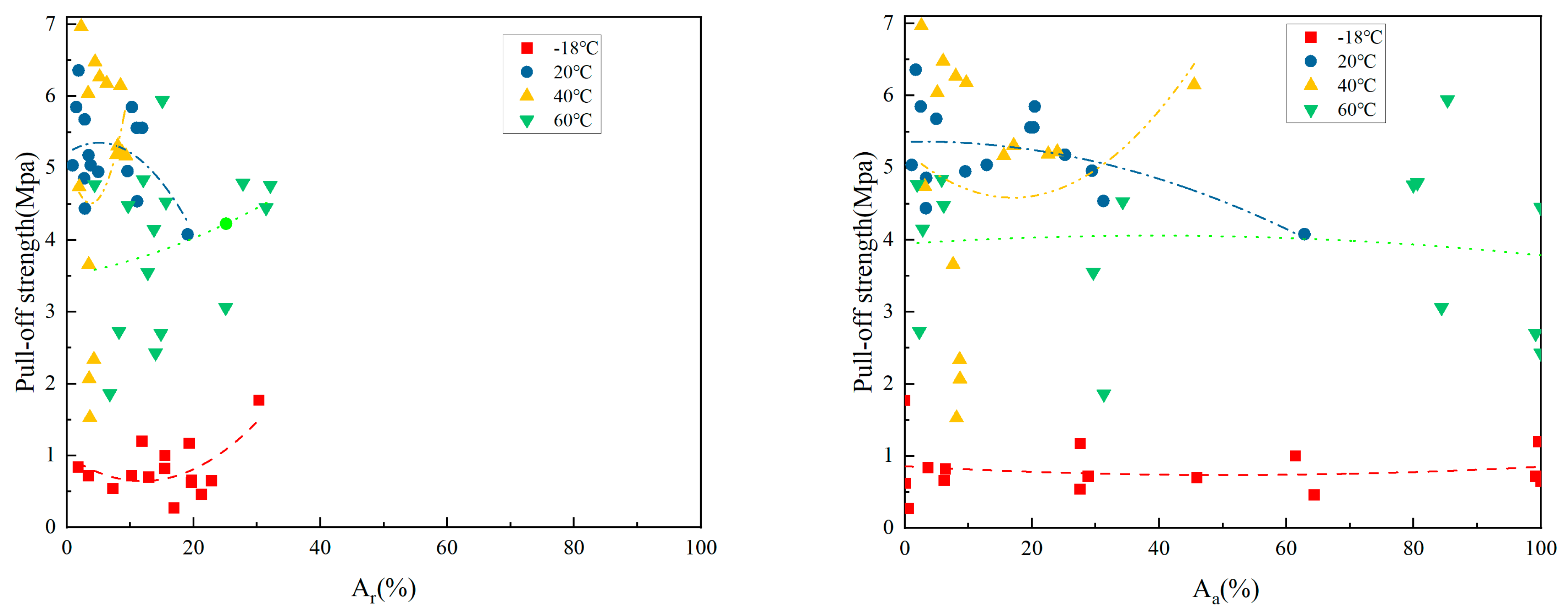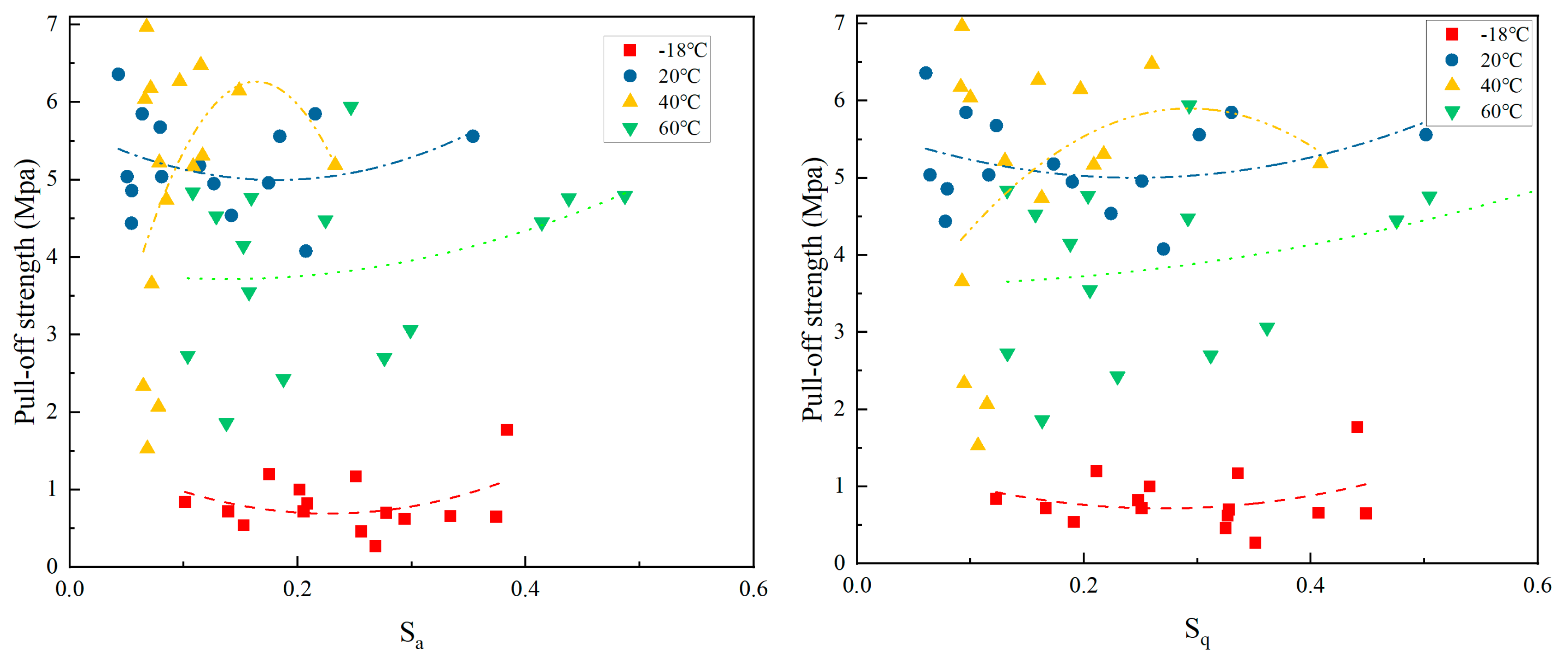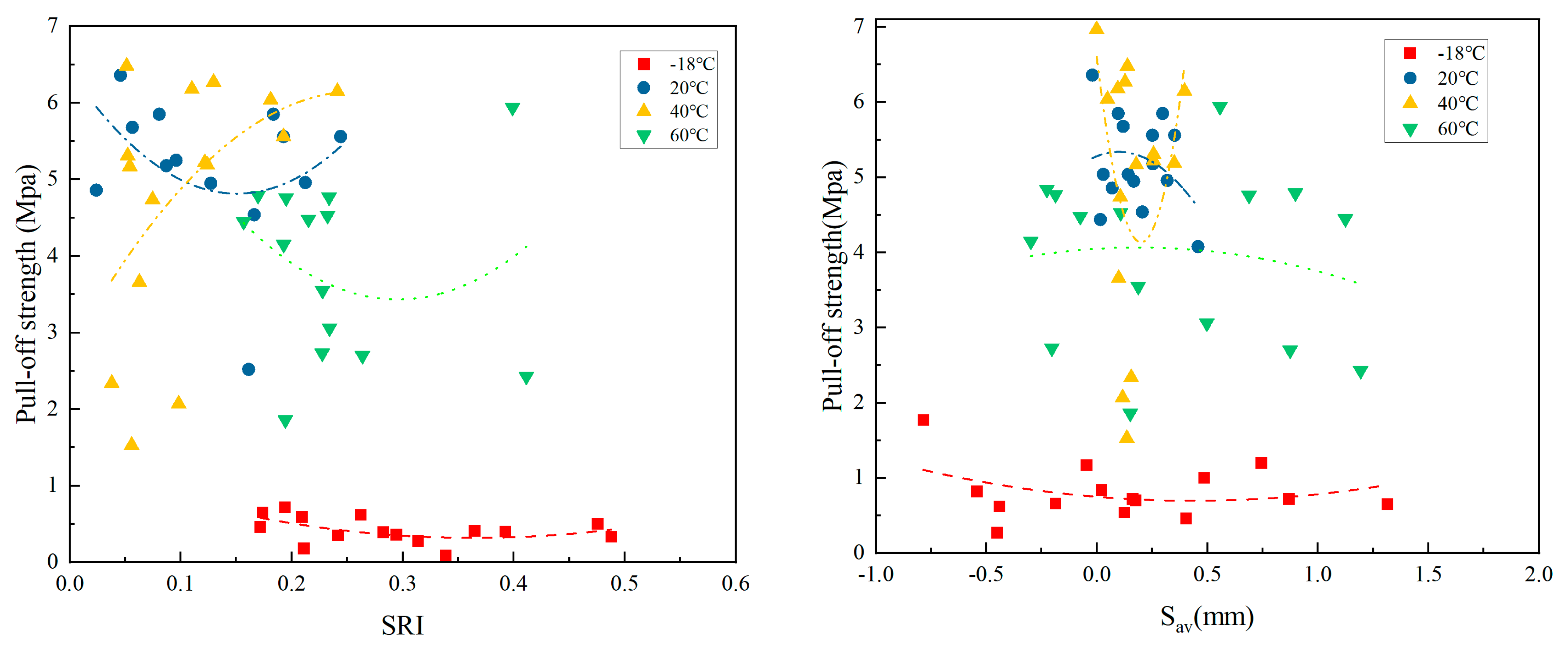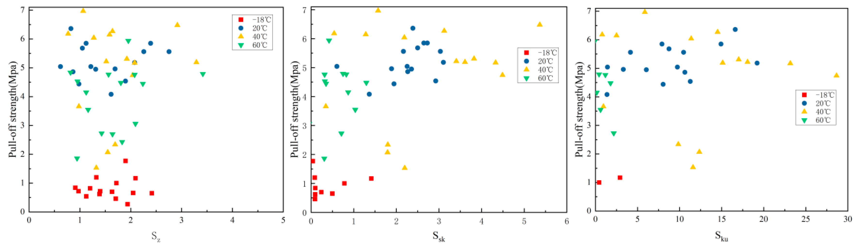 3.2. Relationship Between Surface Texture Parameters and Drawing Strength of Concrete Substrate at Different Temperatures