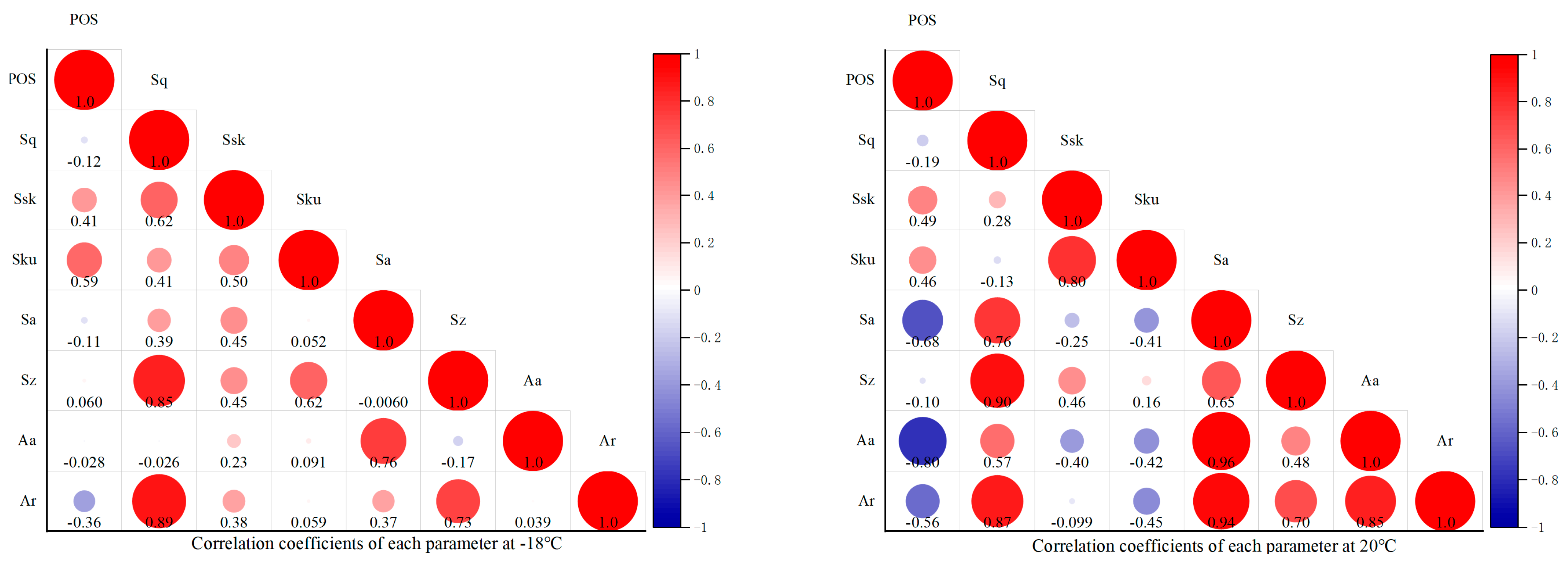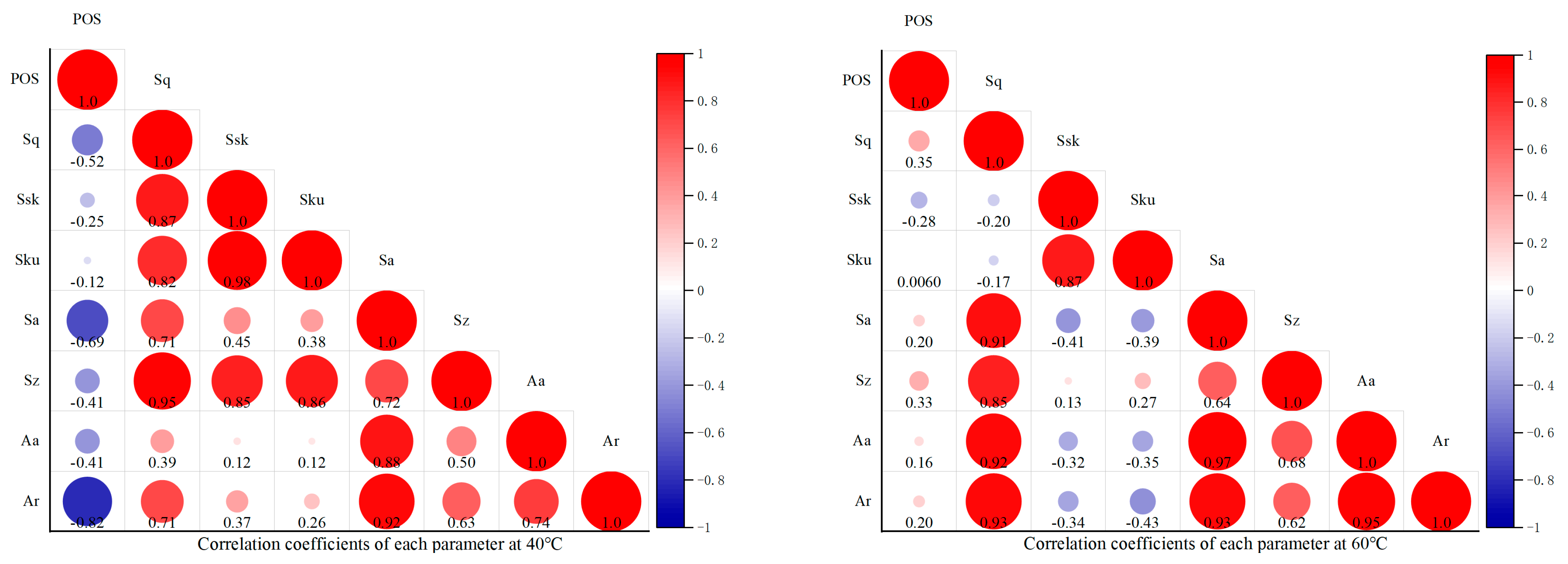 3.3.1. Correlation Coefficient Between Three-Dimensional Parameters and Drawing Strength at Different Temperatures
