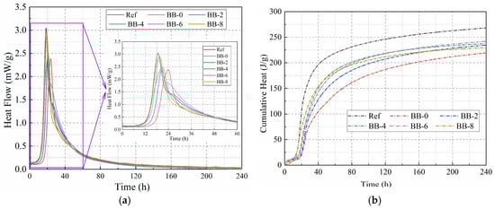 In this study, lightweight artificial aggregates were prepared using CSW, CCS, and specific proportions of F-BB as shell materials at low W/B. Therefore, the influence of the type and amount of shell material on the hydration characteristics was investigated. Figure 4a,b show the hydration exothermic curves and cumulative exothermic curves of the shell materials with a hydration reaction time of 240 h, respectively. The results show that CCS not only slowed down the hydration reaction rate of CSW but also caused a significant decrease in the cumulative heat of hydration. The cumulative heat of hydration for the BB-0 group at 3 and 10 d was 153 J/g and 219 J/g, respectively, which was lower than that of the Ref group. According to Figure 1d, CCS and the hydration products of Portland cement contain a large amount of calcium hydroxide, and the incorporation of CCS hinders the hydration reaction of residual tricalcium silicate (C3S) and dicalcium silicate (C2S) in CSW, which results in the decrease in the exothermic rate and cumulative heat value. In addition, F-BB effectively eliminated the negative effects of CCS on the hydration reaction rate and cumulative heat of hydration of the binder materials. The 10 d cumulative heat of hydration values of the binder materials were 234.7 J/g, 237.4 J/g, 241 J/g and 229.7 J/g when the F-BB content was 2%, 4%, 6%, and 8%, respectively, which were all higher than that of the BB-0 group at 219 J/g. According to a related report [], the protrusions on the surface of BB microparticles act as “nucleation” sites during the hydration of mortar, accelerating the growth of hydration products such as hydrated calcium silicate and improving the hydration reaction rate. Furthermore, the numerous pores on the surface of BB particles provide additional space for the growth of hydration products, which improves the degree of hydration reaction and, to some extent, counteracts the negative effect of CCS on the hydration reaction [,].