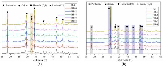 Figure 5a shows the XRD test results of the shell materials of artificial aggregates cured for 30 d under the AC system. The results show that a certain percentage of unhydrated C3S and C2S remained, which implies that under the low W/B strategy of artificial aggregates (W/B = 0.22), the participation of unhydrated cement particles in hydration was insufficient. In contrast, F-BB promoted the hydration process of the binder materials, and this effect became more significant with increasing F-BB content. As shown in Table 1, every 2% increase in F-BB content required an additional 25 kg of mixing water, which was adsorbed in the internal pores of F-BB and effectively improved the hydration of CSW through a slow-release effect during the curing period of the artificial aggregates. In addition, as shown in Figure 5b, the C3S, C2S and calcium hydroxide content decreased under the CC system, which indicated that the carbonation reaction consumed a large amount of calcium hydroxide, thereby further improving the degree of CSW hydration.