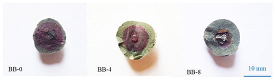 Figure 10 shows the degree of coloration of the aggregate cross-section under the AC system, and the results indicate that the cross-sections were significantly colored in all groups. Compared with the Ref group, the incorporation of CCS and F-BB had little effect on the carbon dioxide uptake of the artificial aggregates, which means that the trace amount of carbon dioxide in the air did not penetrate effectively into the interior of the aggregates, and only the surface portion underwent carbonation.