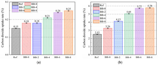 Under the CC system, compared with 2.52% in the Ref group, the carbon dioxide uptake rate of BB-0 increased to 3.26%, which was attributed to the fact that CCS provided sufficient calcium hydroxide for the carbonation reaction. However, the carbonation reaction caused the aggregate surface matrix to become denser and blocked carbon dioxide transport to the core, preventing full utilization of the uptake potential. Consistent with the coloring of the aggregate cross sections, the carbon dioxide uptake rate of the aggregates gradually increased with increasing F-BB content. The uptake rate per unit mass of aggregate increased to 4.13%, 5.05%, 5.72%, and 5.78% when the F-BB content was 2%, 4%, 6%, and 8%, respectively.