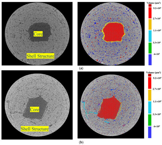 Figure 15 shows that the shell material matrix contained a large number of small pores with diameters less than 10 μm, in addition to a notable number of large pores with diameters greater than 60 μm. This was due to the incorporation of a certain percentage of F-BB in the shell matrix material. In addition, the ITZ between the core and the shell matrix contained numerous pores with sizes between 20 and 60 μm (yellow area), which was one of the main reasons for the deterioration of bonding ability and mechanical properties of the aggregates.