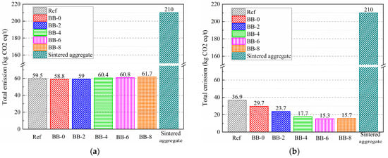 Total carbon emissions per ton of artificial aggregate under (a) AC system and (b) CC system.