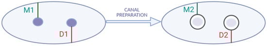 M1—The shortest distance from the mesial external surface of the sample’s root to the mesial wall of the non-instrumented canal (Figure 2).