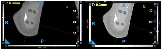 Representative CBCT axial—horizontal slices of samples at 9 mm from the apex, before (a) and after (b) canal preparation—OTR movement. The letters A, P, R indicate sides—anterior, posterior, and right respectively.