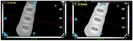 The analysis of this study was performed using CBCT. The authors decided to use 8 cm × 10 cm field of view, because they aimed to obtain scans of all samples from one group in one CBCT. In spite of the authors performing CBCT with a voxel size of 0.3 mm instead of a smaller size, e.g., 0.2 or 0.15 mm, previous studies demonstrated that a bigger voxel size does not influence linear measurement detail [,]. It should be noted that increasing the voxel size could reduce image sharpness, but the final measurement quality is also influenced by, e.g., measurement software and CBCT devices. On the other hand, in a clinical aspect, increasing the voxel size leads to a reduction in radiation dose [,]. In order to improve the quality of measurements, an additional ImageJ software was used in this study. The lack of clear guidelines regarding the parameters of CBCT such as field of view, voxel size, and exposure parameters for laboratory tests could disrupt and complicate the comparisons of findings from different studies []. Therefore, it would be advisable to standardize imaging in laboratory studies. The analyses were performed using CBCT, which enables both quantitative and qualitative evaluation, without destroying the samples. Furthermore, the data obtained from CBCT are more advanced compared to traditional methods, such as periapical radiography. Moreover, three-dimensional images allow for the analysis of samples from various angles, which is crucial for a comprehensive assessment of structures, and is an accurate method for wall thickness, CT, and CCA measurements [,]. However, in some cases, high-density materials such as root canal sealers and interradicular posts may lead to lower image quality and contrast. This limitation might make measuring the remaining dentine thickness difficult []. Alternatively, specimen analysis could be performed using micro-computed tomography, as it allows a more detailed two- or three-dimensional analysis of the root canal anatomy, as well as its preparation and tissue loss [,,,].