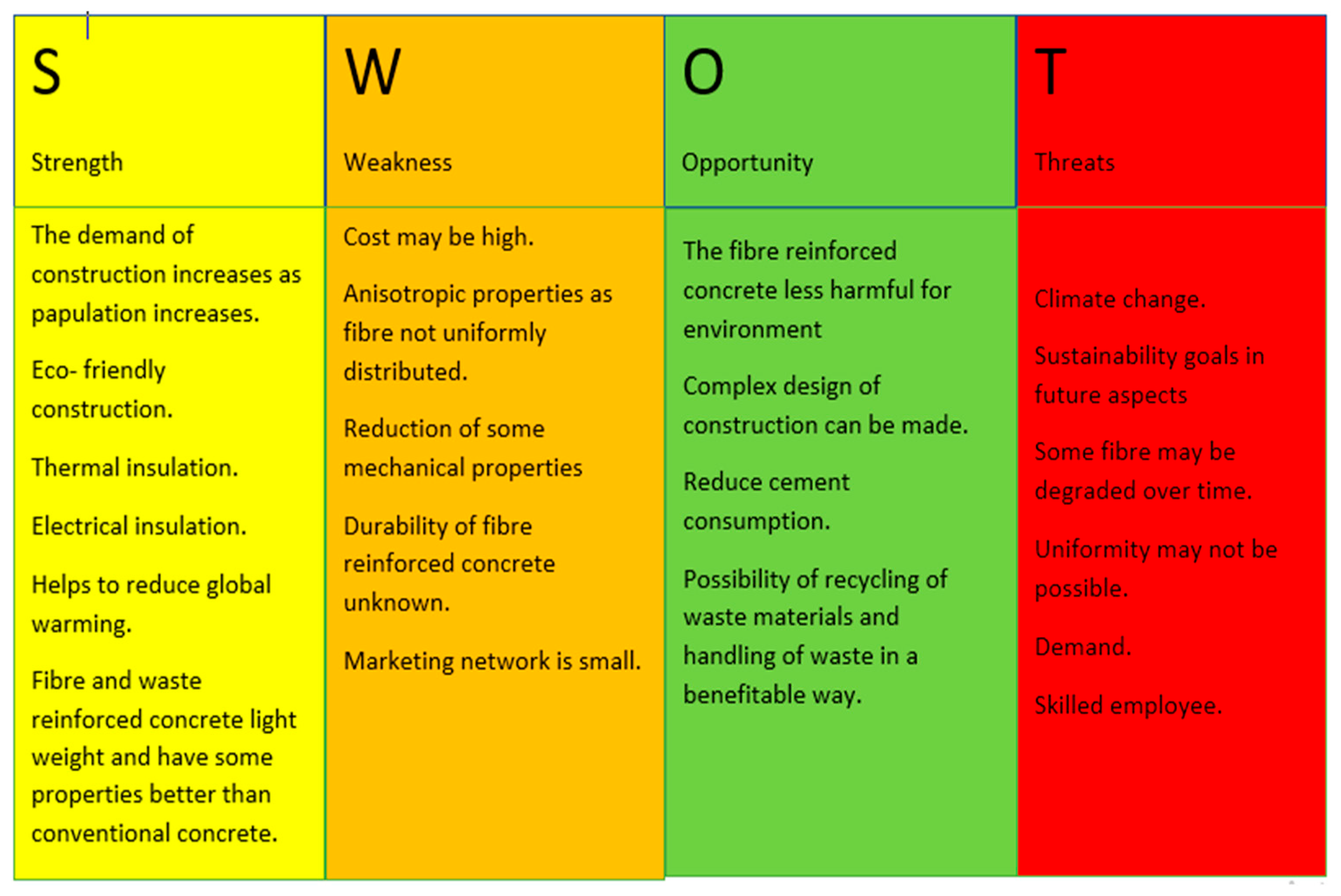 In this review paper, relevant articles related to the use of fibers and waste materials as reinforcement in concrete were collected from various trusted sources. The fundamental field of interest was represented and identified by different keywords. The keywords of search were “waste reinforced concrete”, “mechanical properties of concrete using natural fibre”, “natural fibre reinforced concrete”, “natural and synthetic fibres in concrete”, “synthetic fibre reinforced concrete”, “polyester reinforced concrete”, “industrial waste reinforced concrete”, “textile waste reinforced concrete”, “waste tire rubber in concrete”, “use of waste tire rubber in concrete”, etc. The related literature and articles were gathered and analyzed in detail based on the search keywords. The necessary and related data about the chosen topic was collected from the literature and classified in a systematic manner. SWOT (Strengths, Weaknesses, Opportunities, Threats) analysis of the collected information was performed for analysis of the usage of the fiber-reinforced concrete and waste material-based reinforcement material for concrete and construction in the future to fulfill the Sustainable Development Goals (SDGs). SWOT analysis is one of the best tools for economic and strategic management, as shown in Figure 1.