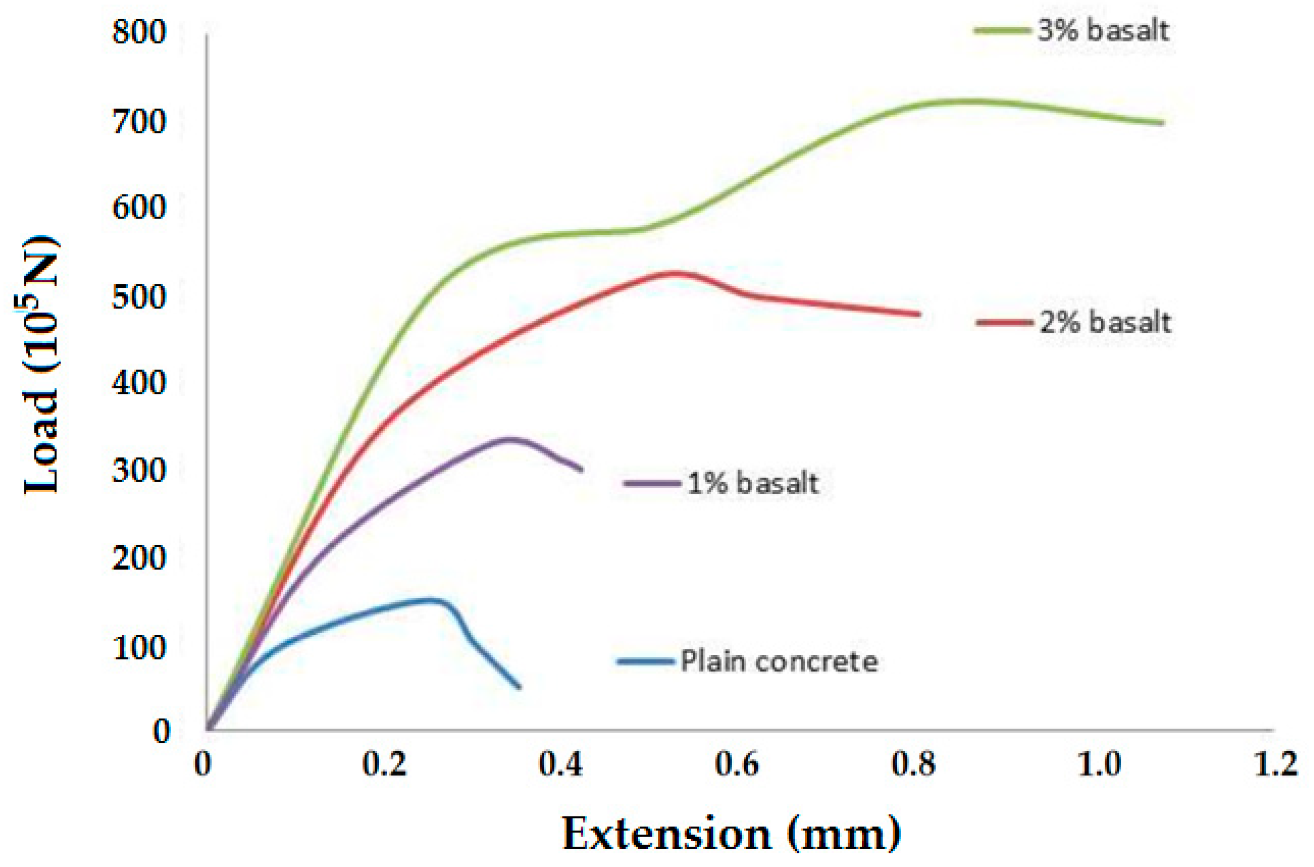 Basalt fiber, which is made from molten rock, exhibits excellent mechanical properties and exceptionally high heat resistance. It is relatively cheaper than carbon fiber and can be applied in thermal insulation, beams, reinforced concrete, and different types of automotive components. Concrete material in which basalt fibers are used shows very high heat resistance, lighter weight, and superior mechanical properties. Researchers have used basalt fiber in concrete and concluded that 2% of basalt fibers used in the overall composition of concrete could improve the flexural strength by 40 to 50% after 14 days of curing [17]. Compressive strength increases up to 92% after 28 days of curing concrete. They also suggested that the optimum time for mixing basalt fibers in the concrete mix should not be more than 1.5 minutes, otherwise the basalt fibers could segregate from the concrete mix. Another study found that the use of basalt fiber in concrete can increase the tensile strength and modulus of rupture [18]. Maximum strength was achieved when the volume percentage of basalt fiber was 1.5%. The modulus of rupture increases by 13 to 57%, and tensile strength increases by 9.6 to 22.58% when the volume fraction of basalt fibers increases to 1.5% [17,18,19]. The heat-conducting capacity of concrete decreases as the percentage of basalt fibers increases. Several researchers concluded that the bending and tensile strength of concrete increases by reinforcing basalt fibers in the concrete mix. The toughness and ductility of concrete increase with the addition of an optimum percentage of basalt fiber [18,19]. It has also been experimentally established that up to 3% basalt fiber reinforcement in concrete gradually improves the tensile performance [20]. The effect is shown in Figure 2.