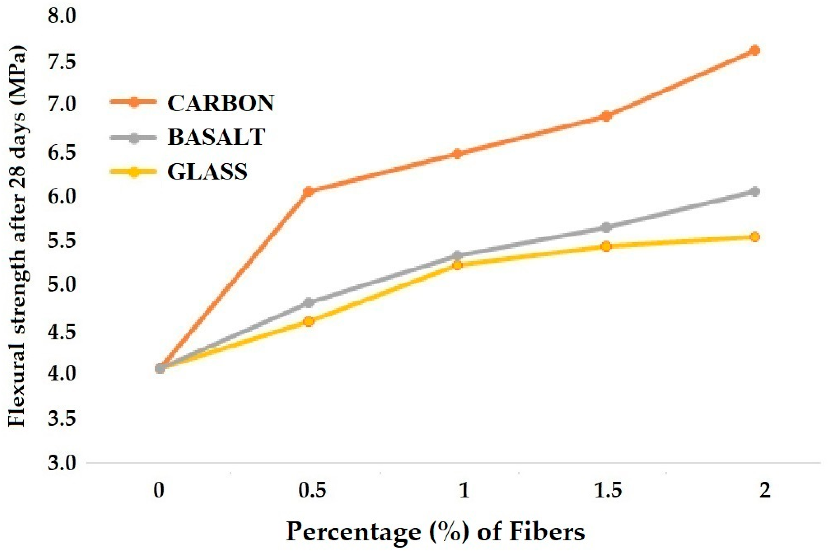 Figure 4 demonstrates the trends in flexural strength of HEM fiber-reinforced concrete when the fiber percentage varies from 0 to 2%. For all three types of HEM fiber-reinforced concrete, the flexural strength value increases when the fiber loading increases from 0.5% to 2%. The carbon fiber-reinforced concrete exhibited higher flexural strength than basalt fiber-reinforced concrete. Glass fiber-reinforced concrete showed the minimum flexural strength. Due to the lower mechanical performance of the glass fibers, the change from 1.5% to 2% of fiber loading is not as significant as in the case of carbon and basalt fibers.