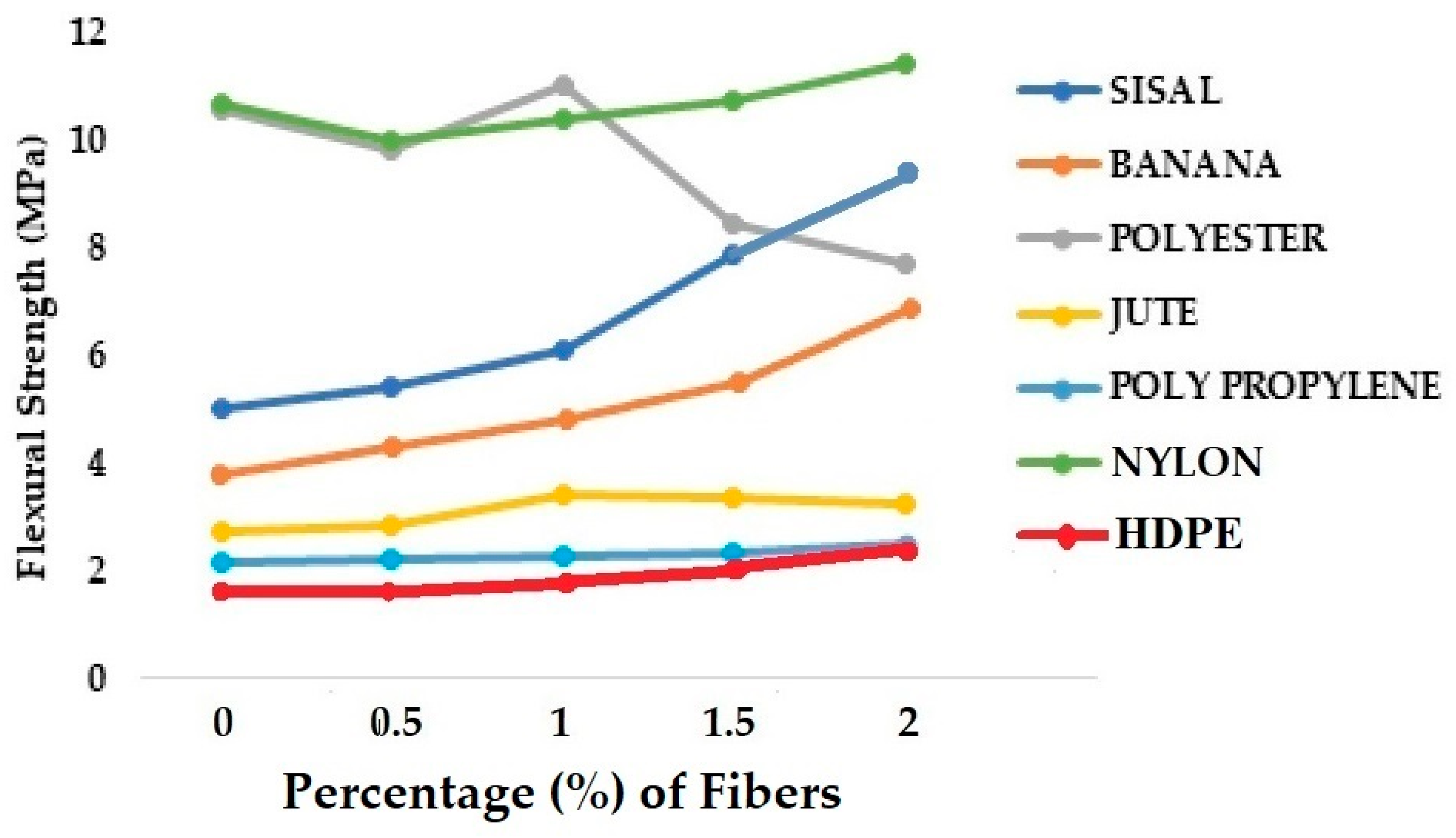 A slightly different trend can be observed in Figure 10. An increase in the percentage of fiber content seems to improve the flexural performance of concrete in most cases, except for polyester fibers. There is an increase in the flexural strength of polyester fiber-reinforced concrete at 1% fiber content. Beyond this, the fibers do not bond well with cement, and there can be occasional fiber slippage. These may not affect the compression behavior, but may significantly affect the flexural strength.