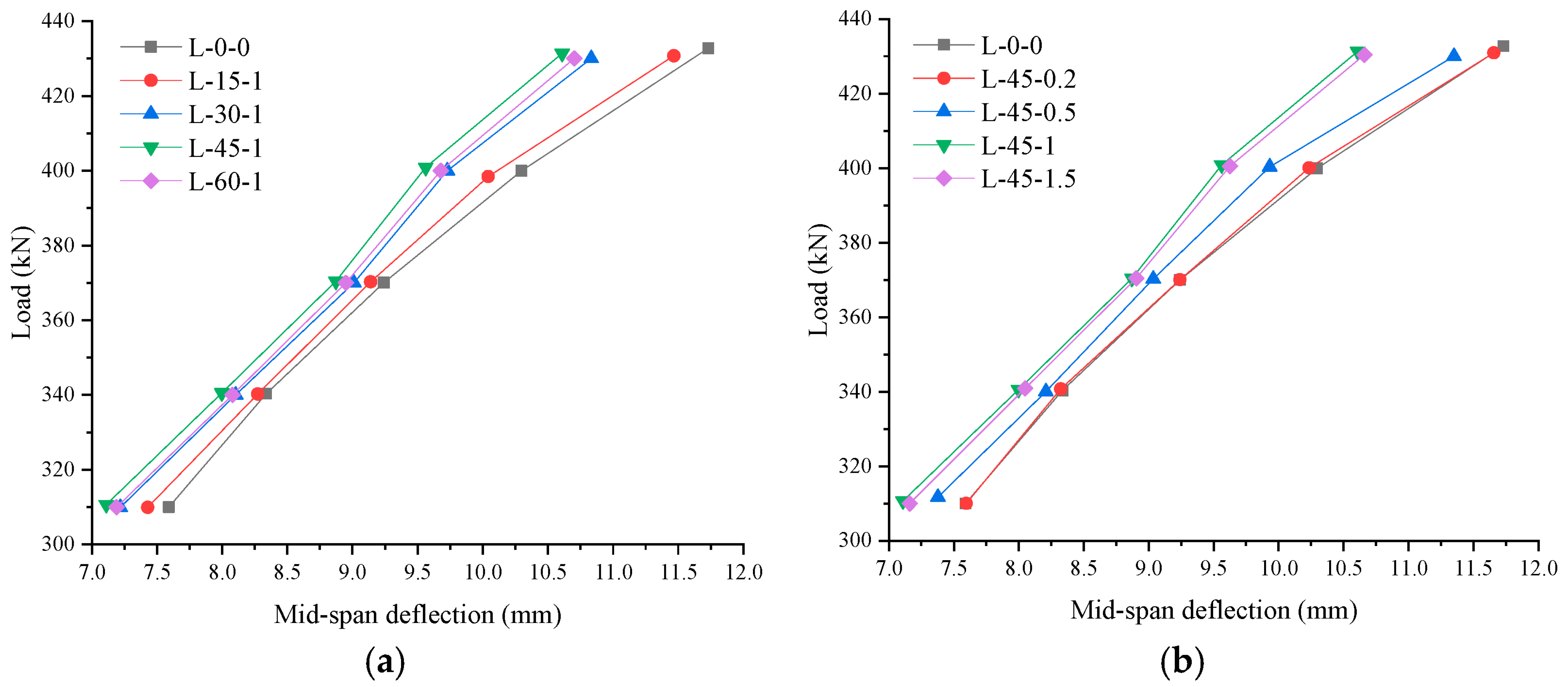 Figure 14. Load–deflection relationship of concrete beams reinforced with bamboo fibers: (a) effect of fiber length; (b) effect of fiber percentage. Adapted from [126].