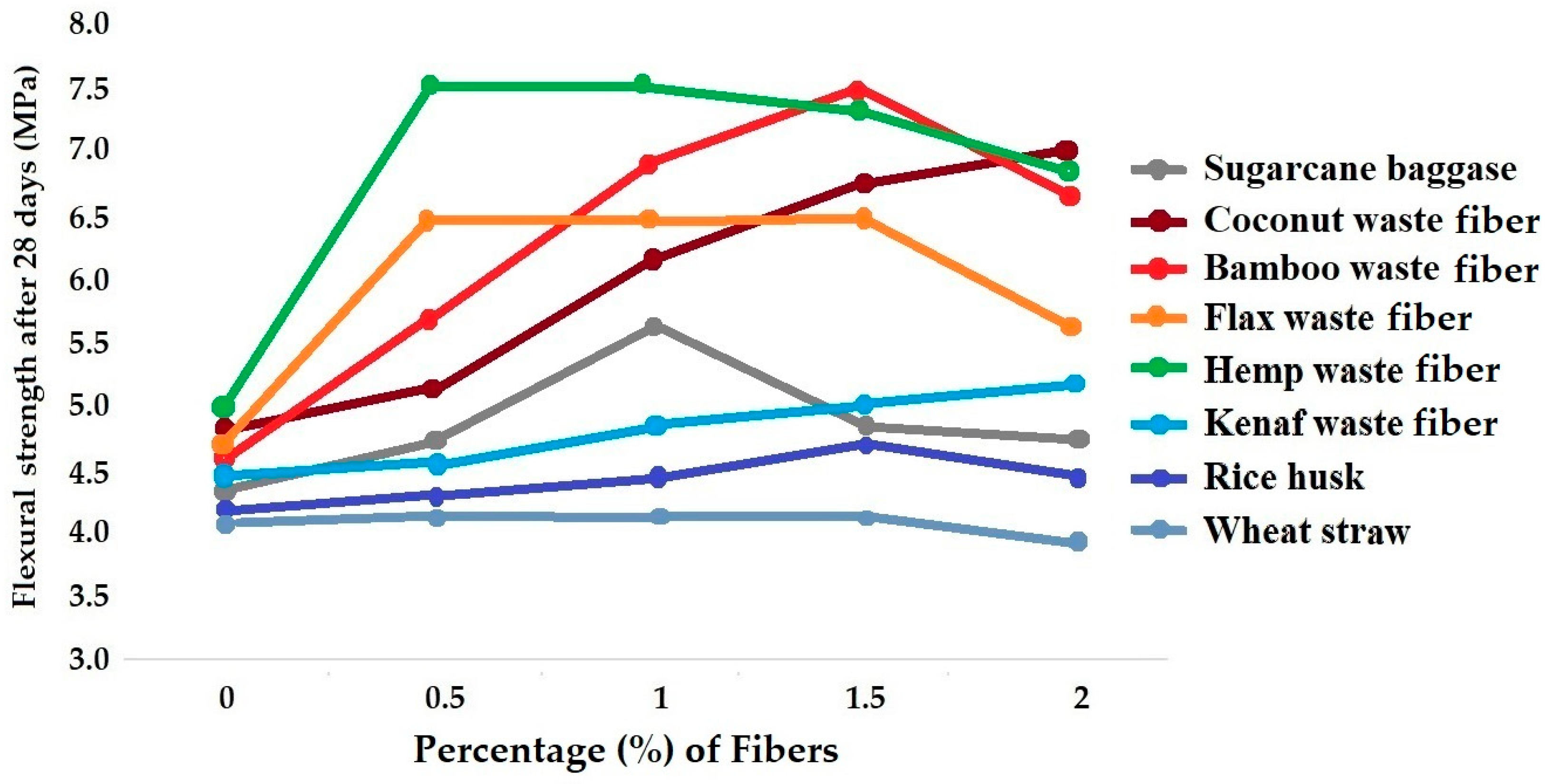 Figure 18. Comparative account of flexural strength for concrete reinforced with different types of biodegradable waste fibers and agrowastes.