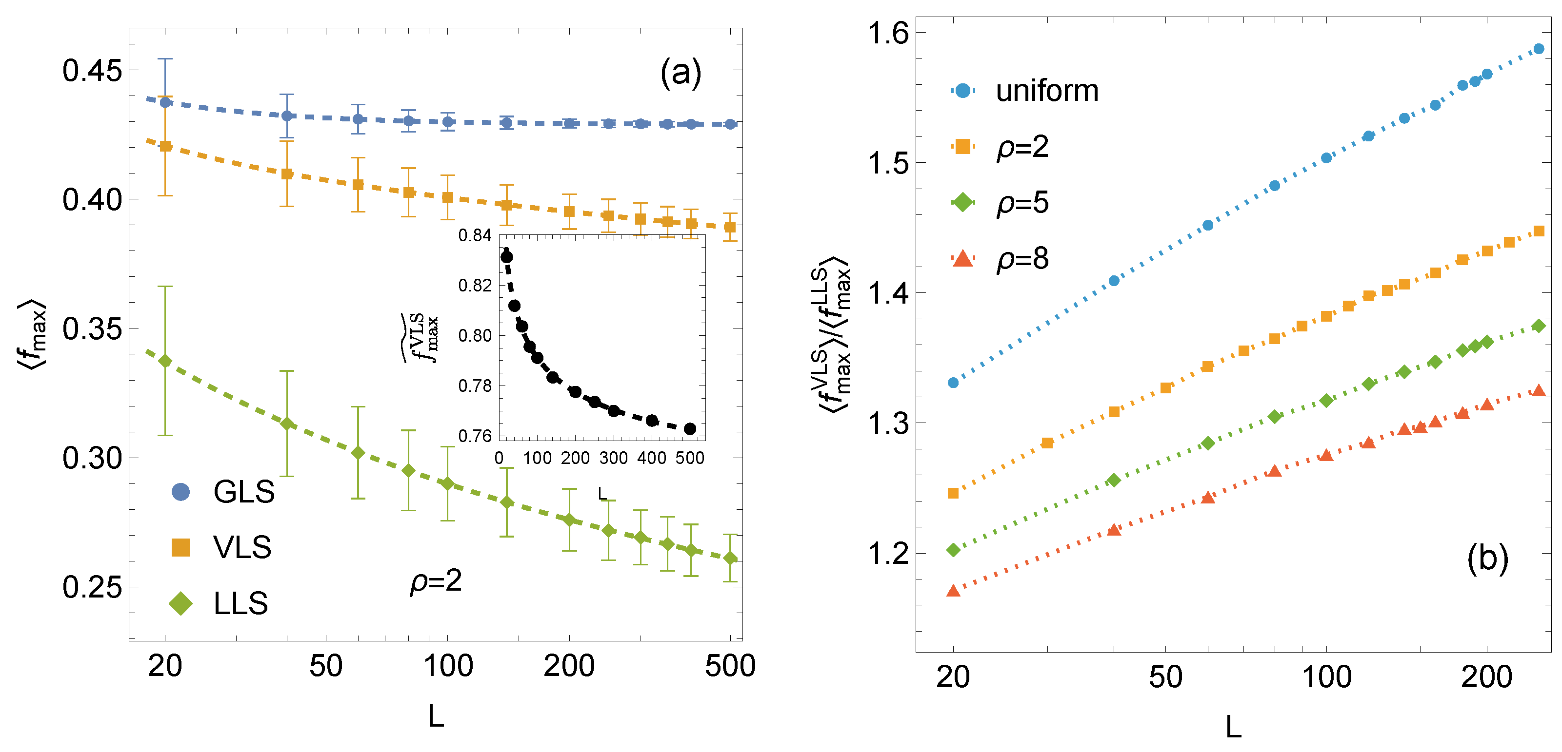 Figure 2. (a) Log-linear plot of the mean strength for arrays of L × L pillars, comparing GLS, VLS, and LLS systems. The GLS, LLS, and VLS curves are fitted using Equations (3), (4), and (5), respectively. Error bars indicate ± 1 standard deviation computed from 10 4 samples. Inset: normalised relative strength of VLS systems, as defined in Equation (6). (b) Log-linear plot of the ratio f max VLS / f max LLS ) for arrays of L × L pillars for the considered distributions of { σ t h } .