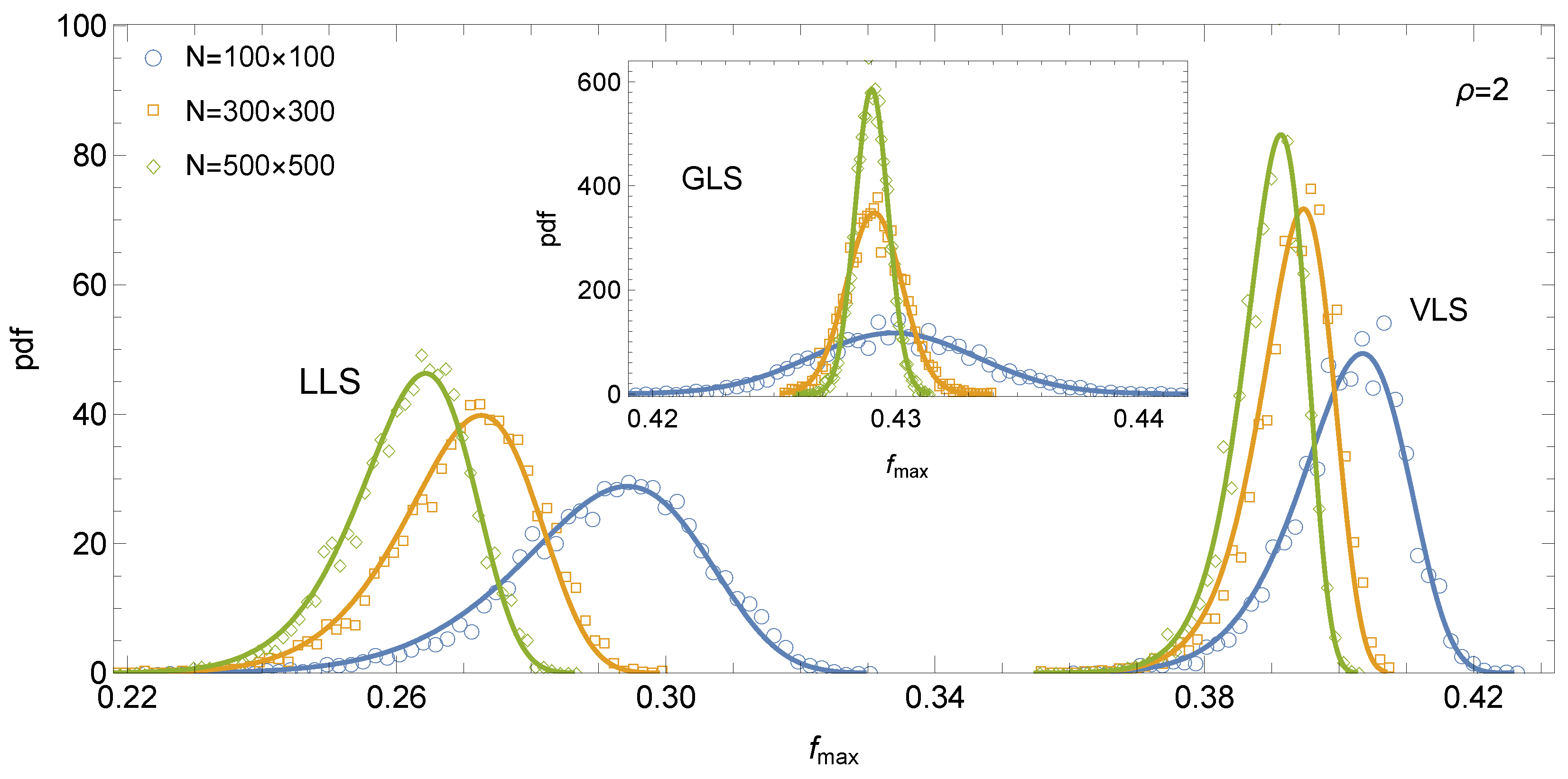 Figure 3. Empirical distributions of f max for increasing system sizes N and different load-sharing rules. Pillar strength thresholds follow Equation (1), with ρ = 2 . Solid lines represent Equation (7), with parameters estimated from the data. The inset shows the corresponding distributions for the GLS rule, where the solid line follows the normal probability density function.