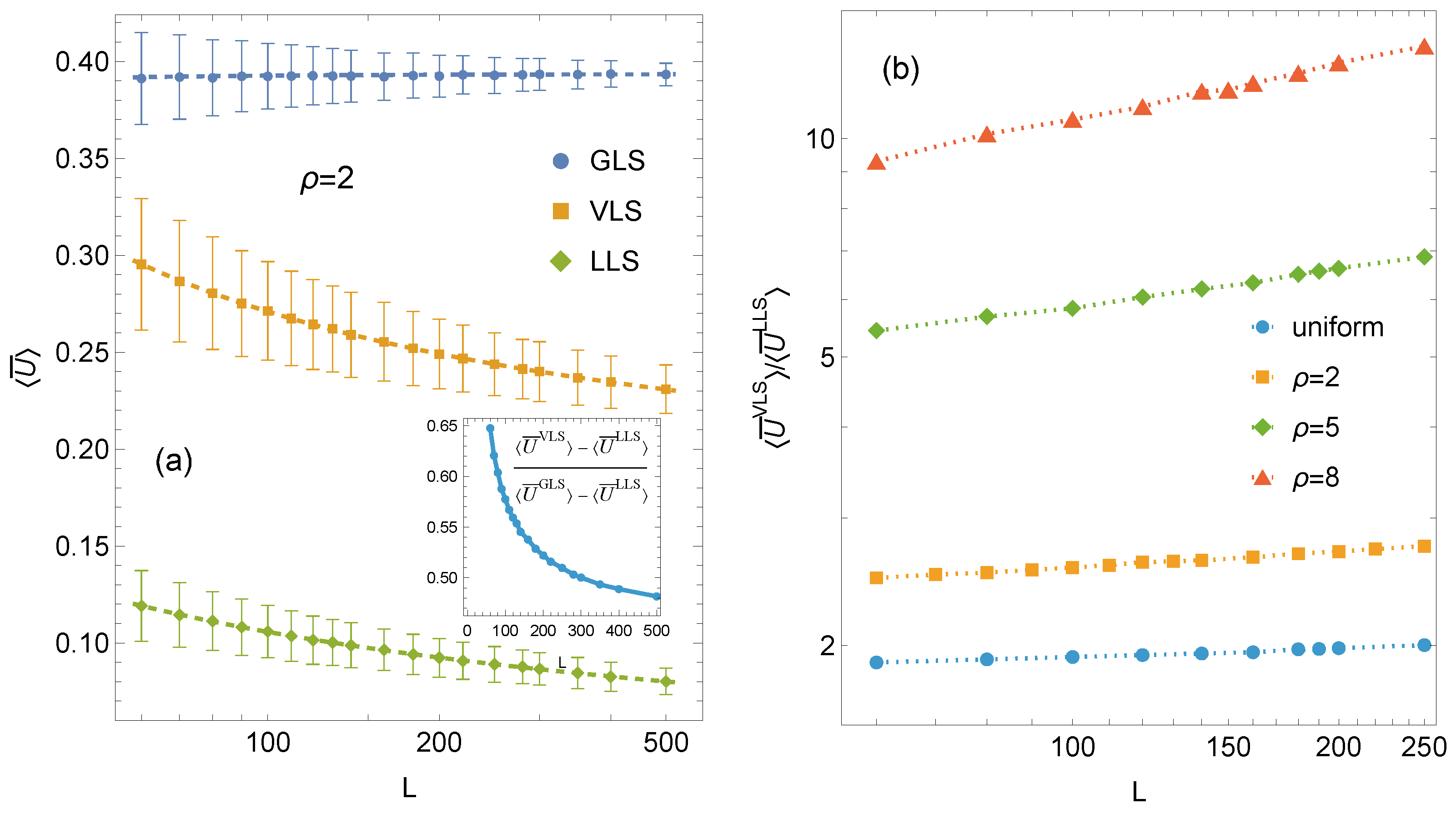 Figure 4. (a) Mean subcritical fraction of failed pillars, U ¯ , for arrays with L × L pillars. Error bars indicate ± 1 standard deviation computed from 10 4 samples. Inset: the relative VLS mean fraction of failed pillars. (b) The variation of ratio U ¯ VLS / U ¯ LLS for different distributions of pillar strength thresholds.