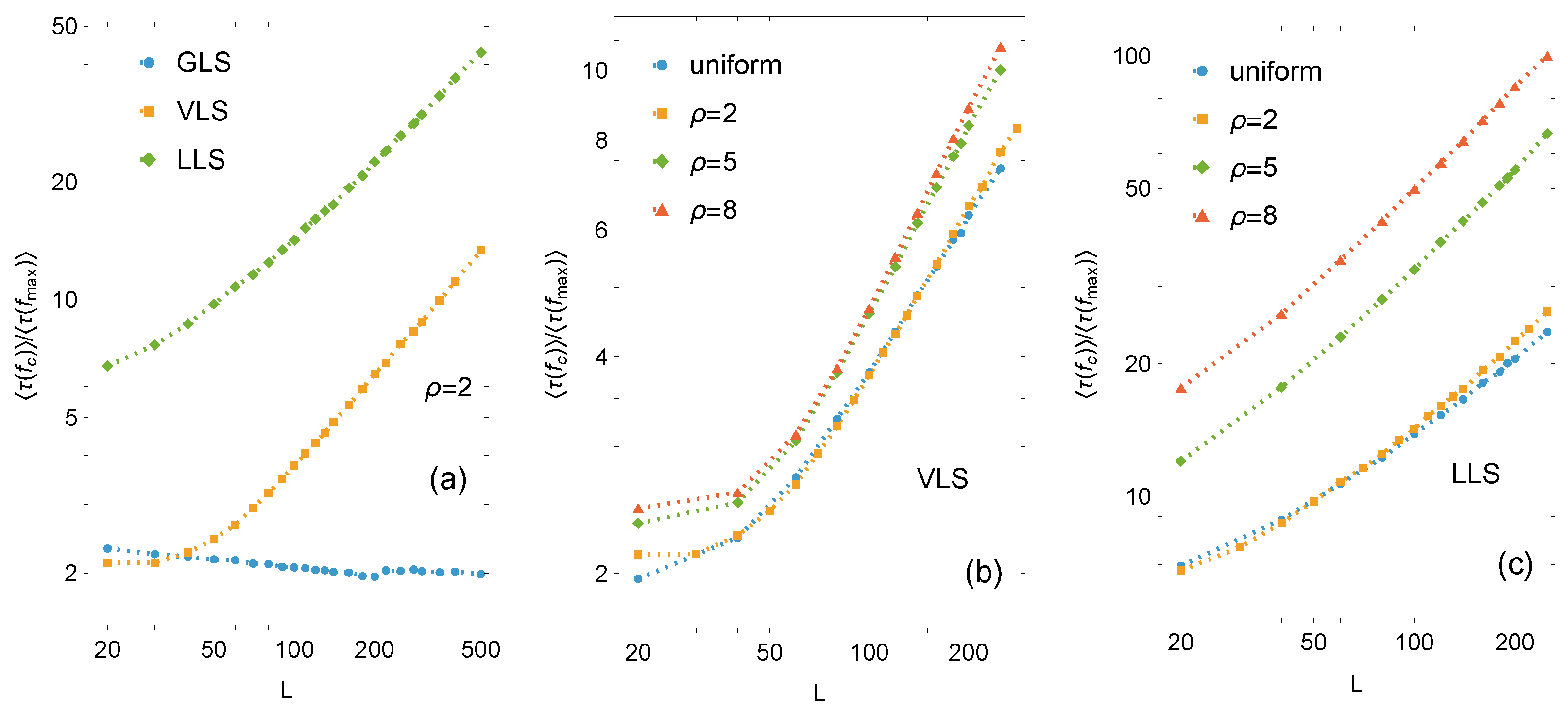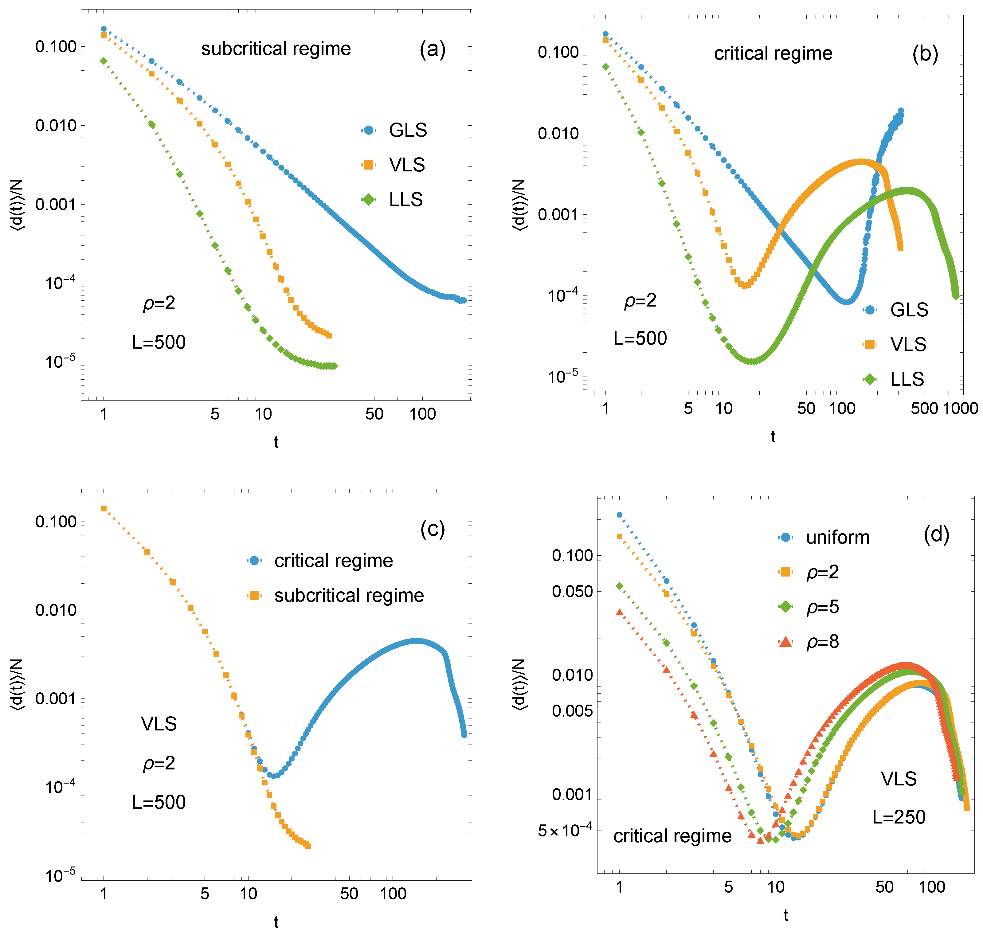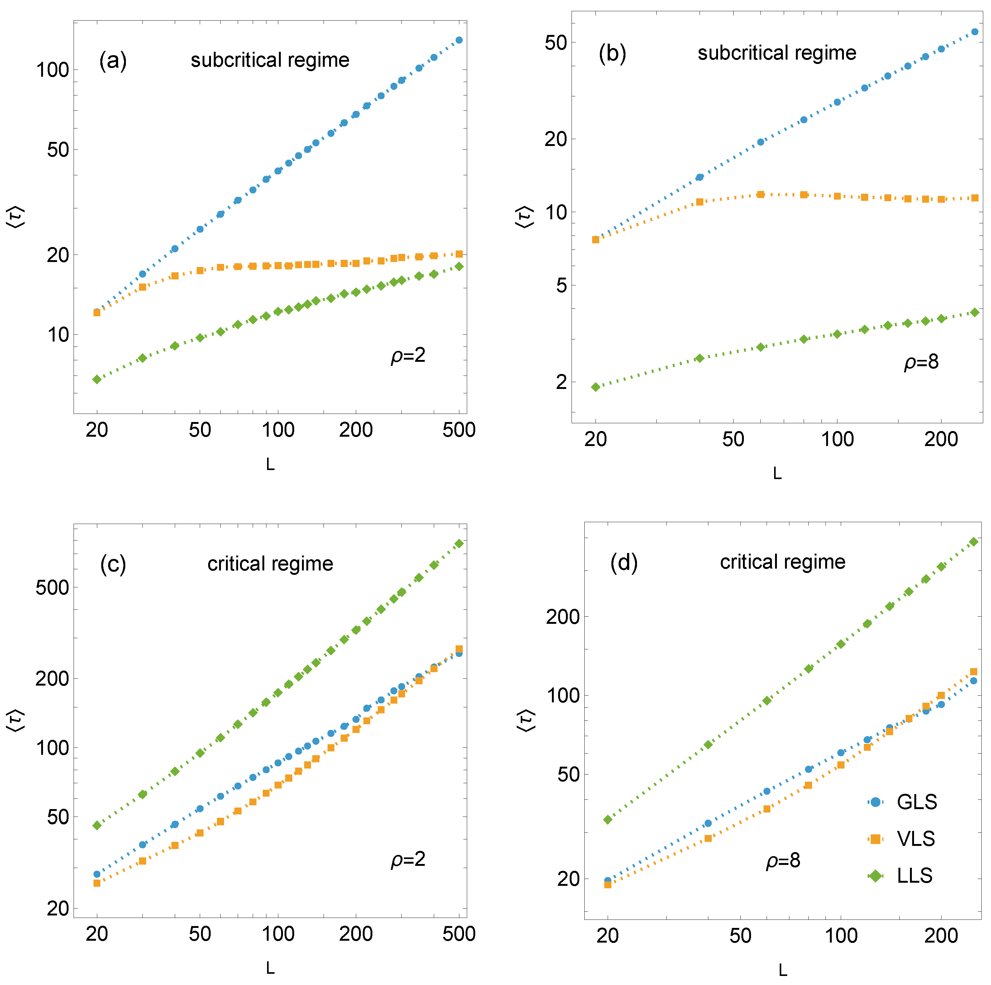 Figure 5. Log-log plots of the mean relaxation time for pillar arrays of size L × L under GLS, VLS, and LLS rules. Panels (a,b) correspond to the subcritical loading, while panels (c,d) represent the critical loading regime. Simulation results are shown as data points; dashed lines are included as visual guides.
