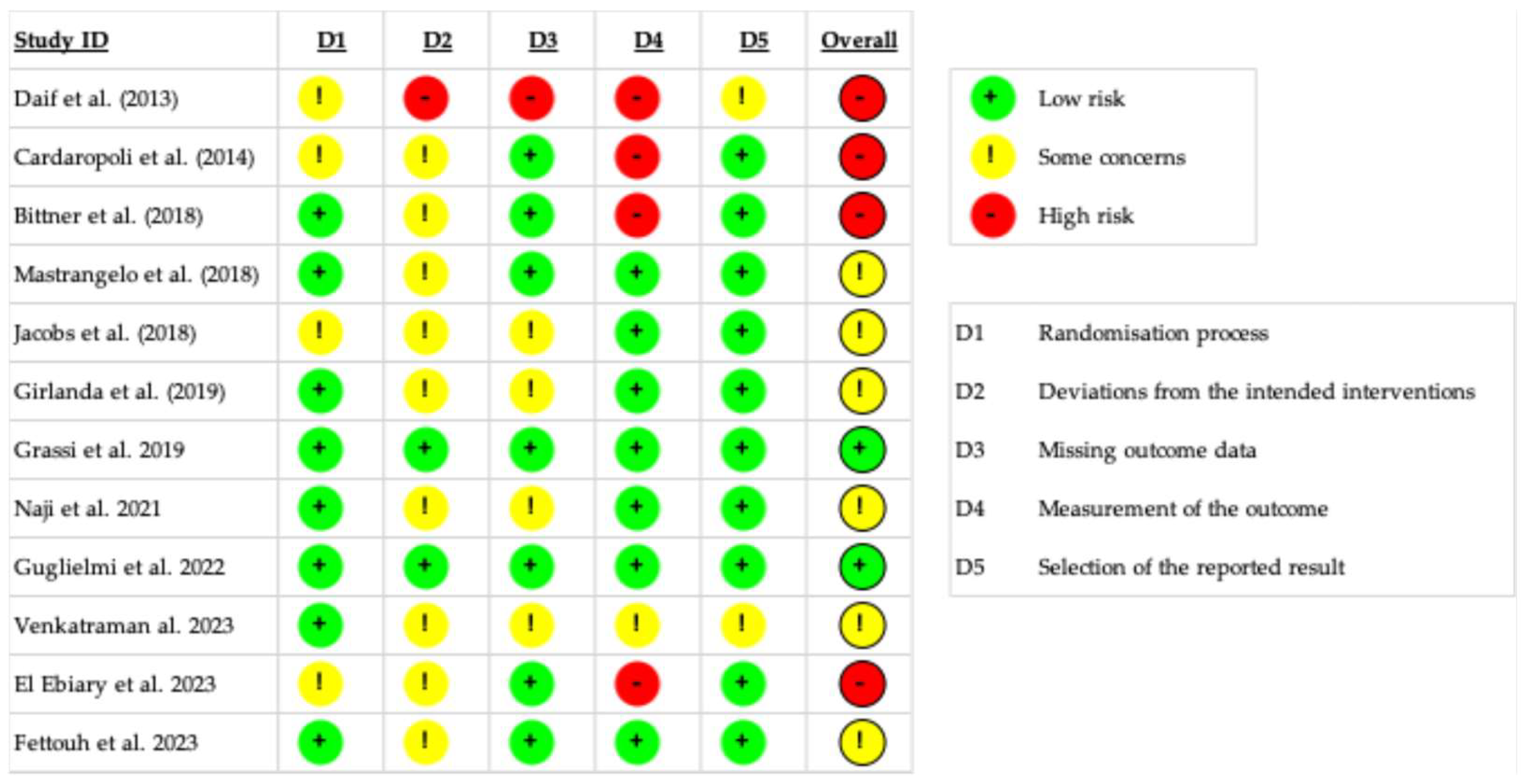 | Post-operative morbidity (pain, VAS/NRS) | 150 (4 RCTs, meta-analysis) | MD = +19.45 mm VAS (95% CI 0.55–38.36; p = 0.04); e.g., Grassi 2019 24 h: 71.4 ± 11.2 vs. 53.2 ± 12.1 mm | Moderate ⨁⨁⨁◯ | Adjunctive procedures increase short-term pain; heterogeneity high (I2 ≈ 97%) but direction consistent. |