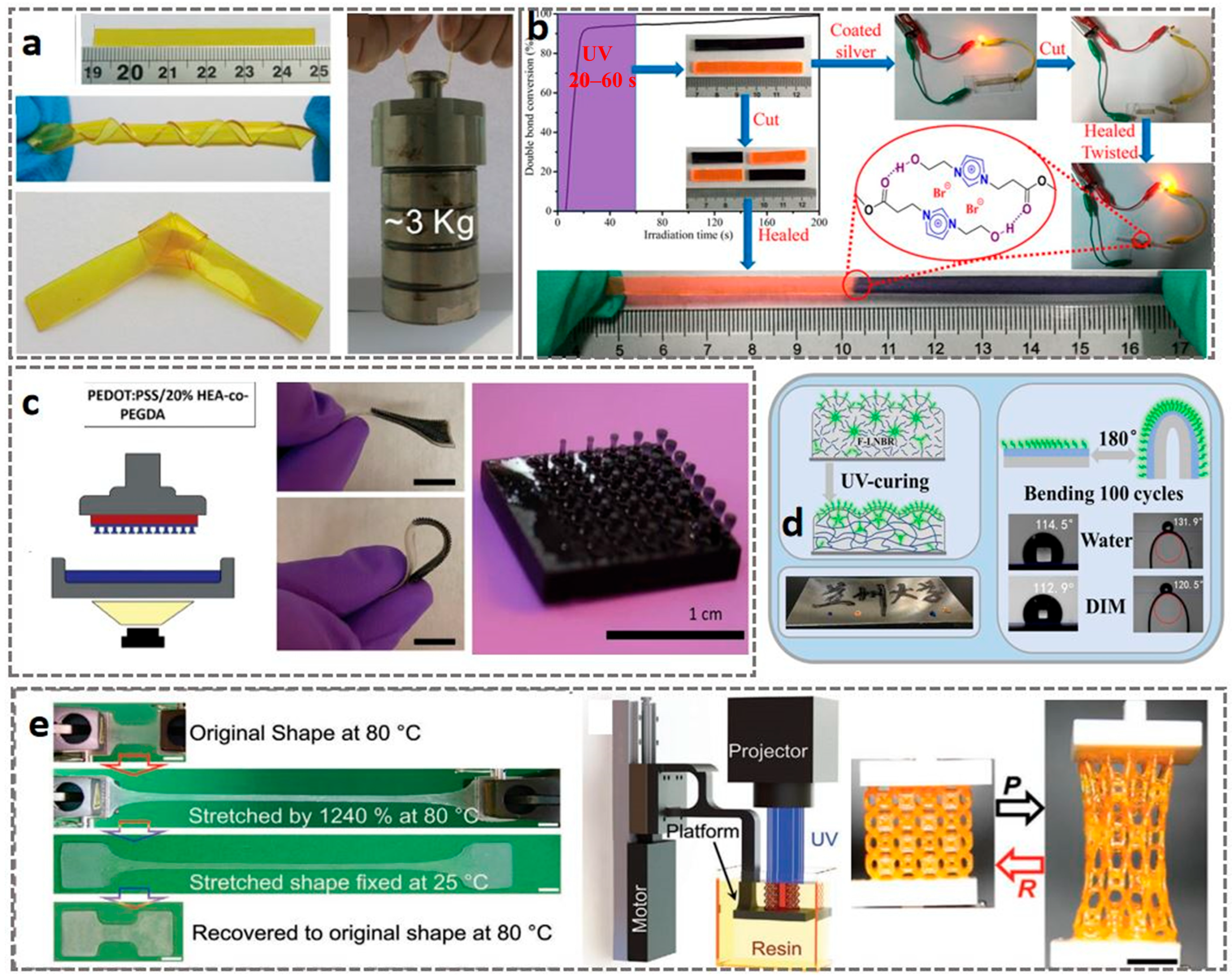 - Zhang, H.; Wang, P.; Zhang, H.; Chen, G.; Wang, K.; Chen, X.; Chen, Z.; Jiang, M.; Yang, J.; Chen, M.; et al. One-Step Digital Light Processing 3D Printing of Robust, Conductive, Shape-Memory Hydrogel for Customizing High-Performance Soft Devices. ACS Appl. Mater. Interfaces 2024, 16, 68131–68143. [Google Scholar] [CrossRef]
