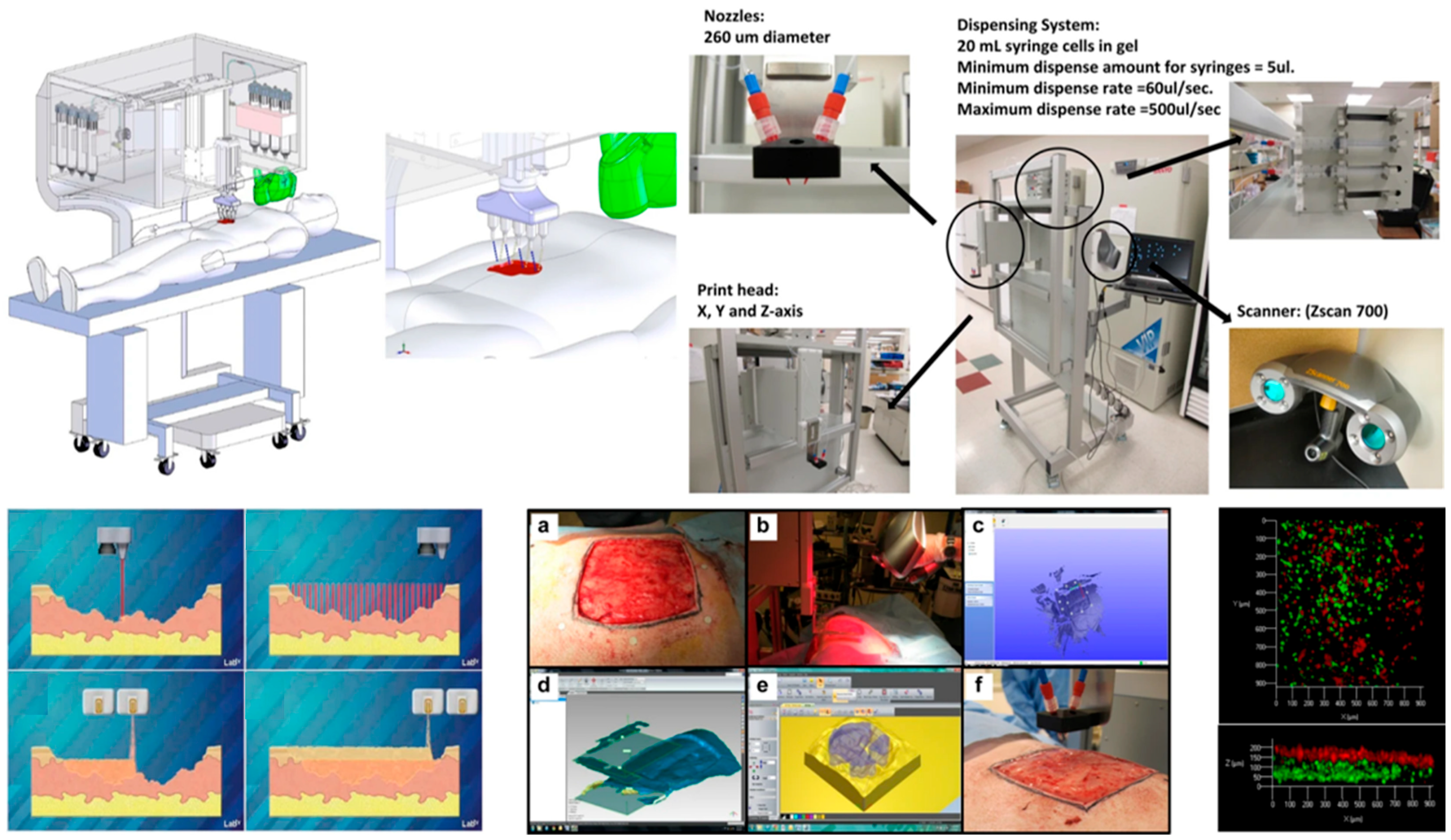 - Albanna, M.; Binder, K.W.; Murphy, S.V.; Kim, J.; Qasem, S.A.; Zhao, W.; Tan, J.; El Amin, I.B.; Dice, D.D.; Marco, J.; et al. In Situ Bioprinting of Autologous Skin Cells Accelerates Wound Healing of Extensive Excisional Full-Thickness Wounds. Sci. Rep. 2019, 9, 1856. [Google Scholar] [CrossRef] [PubMed]