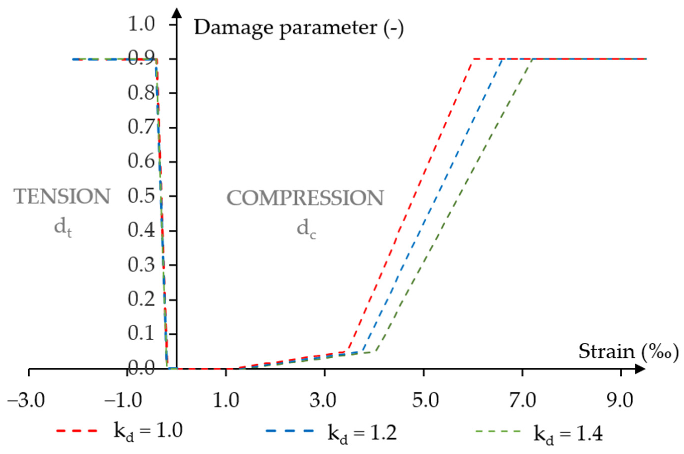 - Sümer, Y.; Aktaş, M. Defining parameters for concrete damage plasticity model. Chall. J. Struct. Mech. 2015, 1, 149–155. [Google Scholar] [CrossRef]