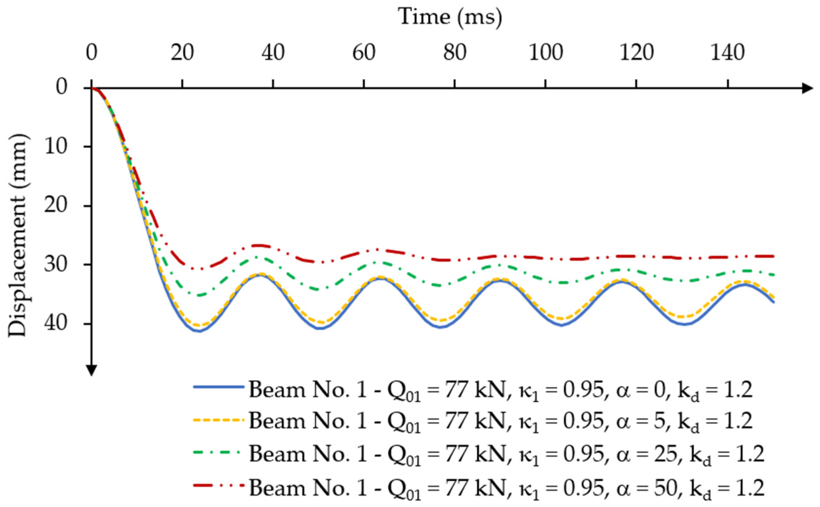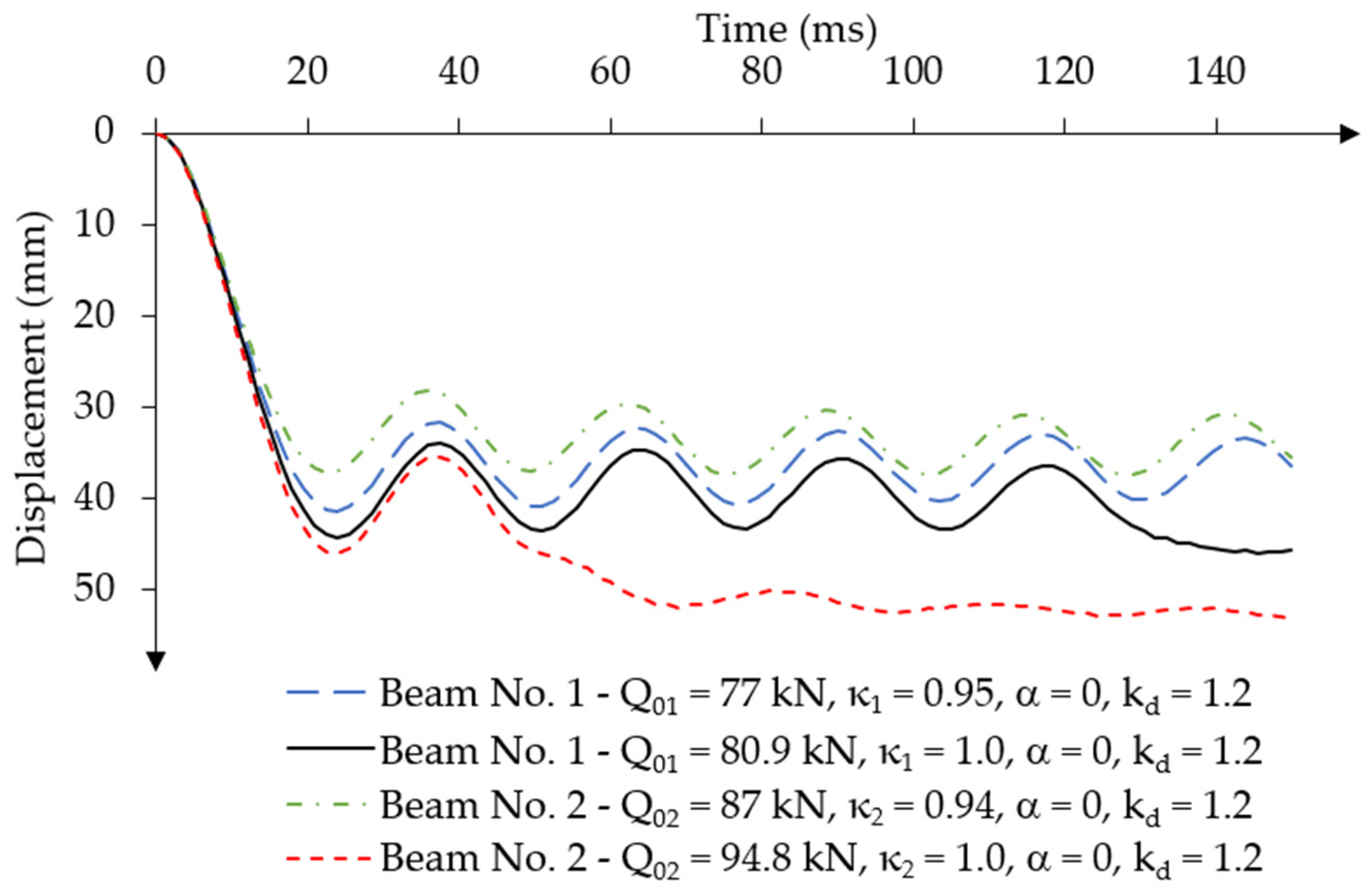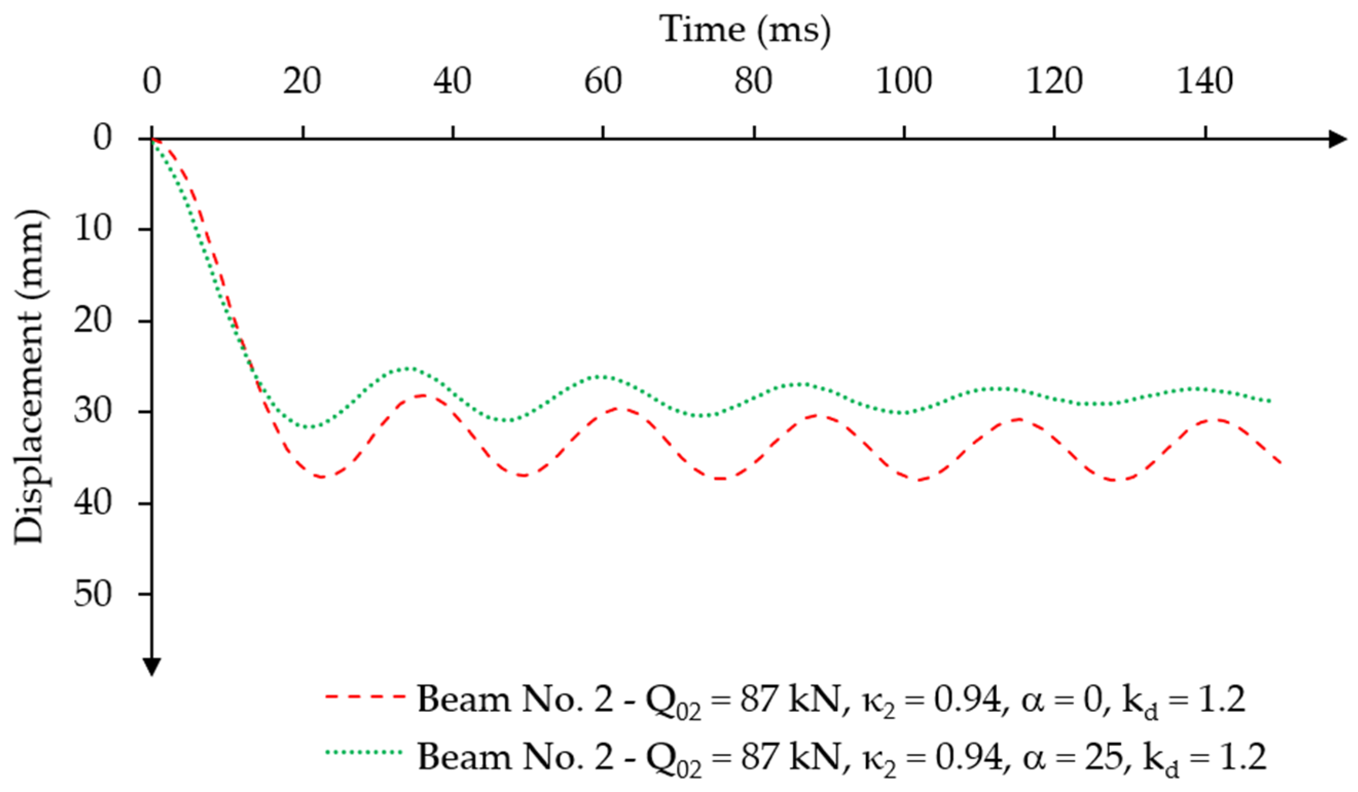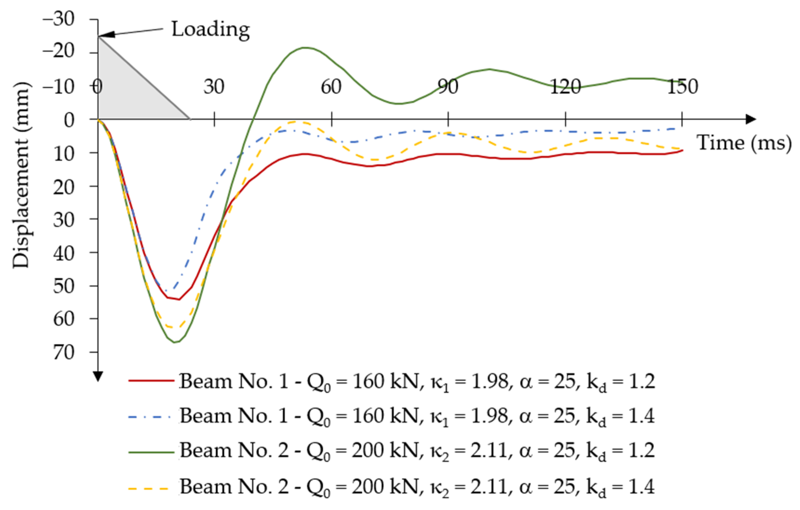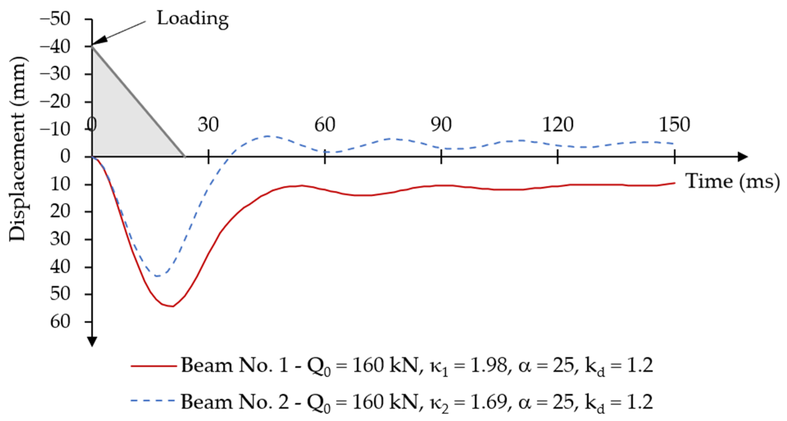- In the numerical simulation of the effects of a constant force impulse over time, the post-tensioned beams obtained a lower load capacity by approximately 5% compared to the load capacity achieved in the experimental static tests [20], regardless of the assumed prestressing eccentricity. A constant amplitude difference was achieved in both beams, which indicates the stability of the method. However, the values of permanent displacements were smaller in the beam with the higher prestressing eccentricity for a load value of 95% of the static load capacity.