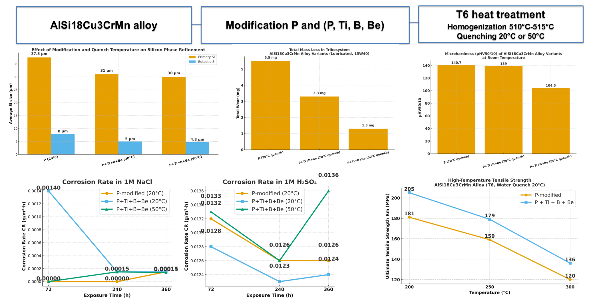 The results obtained from the microstructural, mechanical, tribological and corrosion studies allow for a comprehensive assessment of the influence of the phosphorus (P) modifier and the combination of P, Ti, B and Be on the properties of the AlSi18Cu3CrMn alloy.