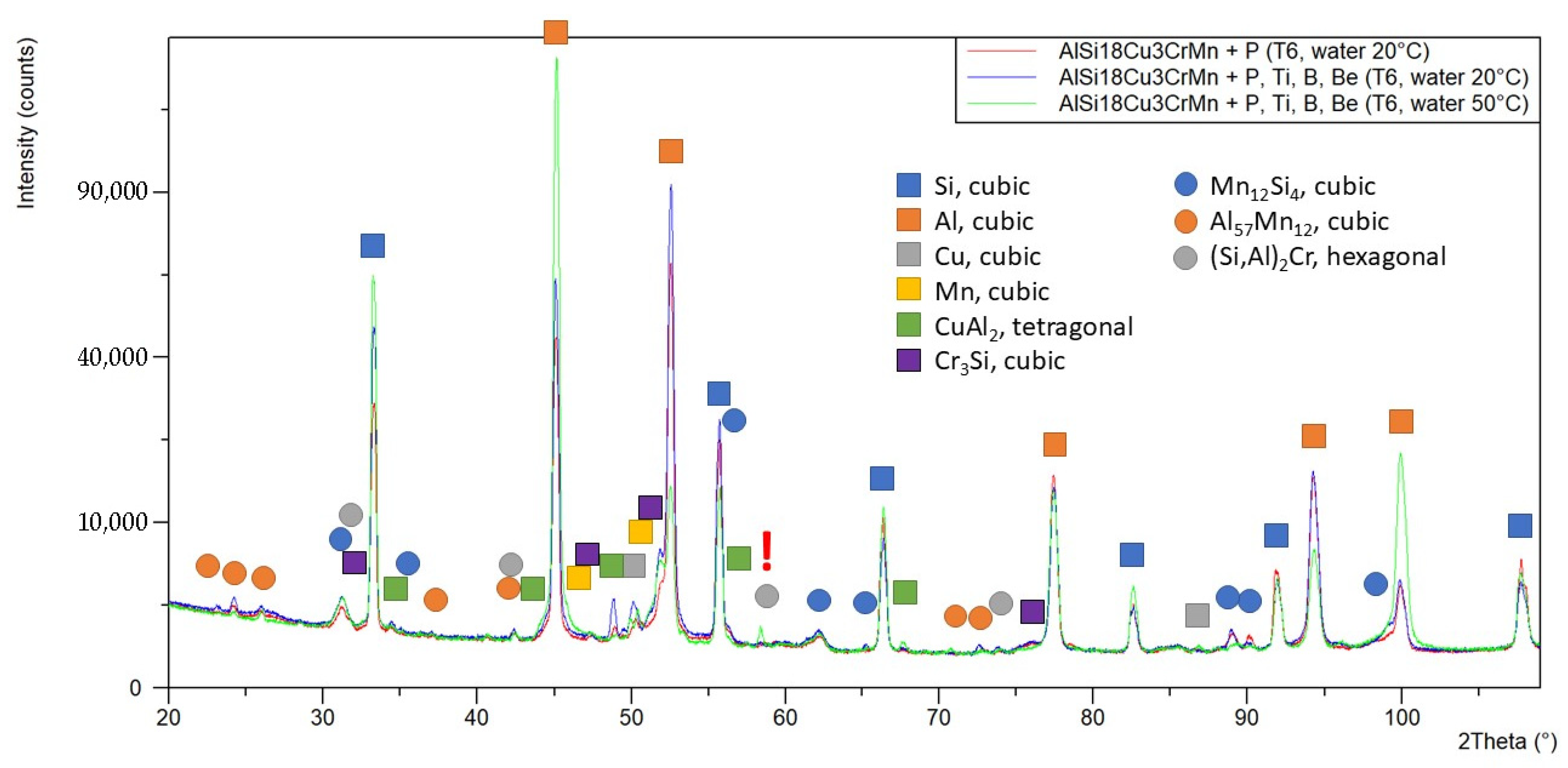 X-ray diffraction (XRD) analysis confirms the presence of intermetallic CuAl2, Cr3Si, Mn12Si4 and Al57Mn12 phases in all samples. Only in the alloy quenched in water at 50 °C was the appearance of the (Si,Al)2Cr phase observed, indicating that a lower cooling rate favors the diffusion of chromium and the formation of stable chromium-containing compounds. These phases increase the thermal stability and hardness of the α-phase but may slightly reduce its ductility.
