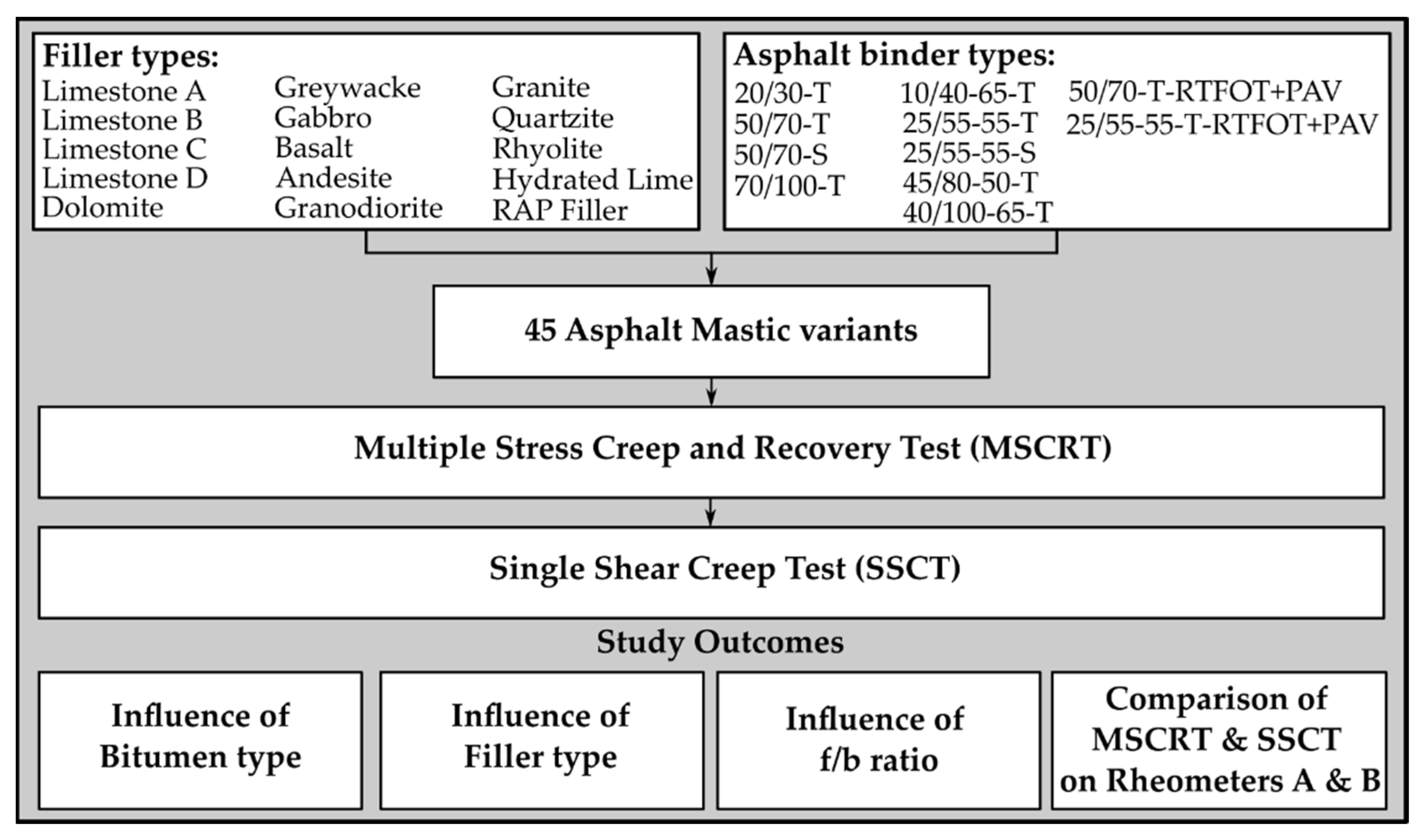 In addition, this study aims to analyse the influence of asphalt binder type, filler type, and f/b ratio on the rheological behaviour of asphalt mastic at high temperature. A total of 45 different asphalt mastic variants are prepared for testing by SSCT and MSCRT. These asphalt mastic variants are prepared by using 11 different asphalt binder types, including unmodified, polymer-modified, and long-term aged asphalt binder, in combination with 15 different mineral fillers. The binder types were selected to represent the most commonly used modified and unmodified asphalt binders in the asphalt construction sector. The selected fillers cover a wide range of chemical compositions, particularly with respect to silicon dioxide (SiO