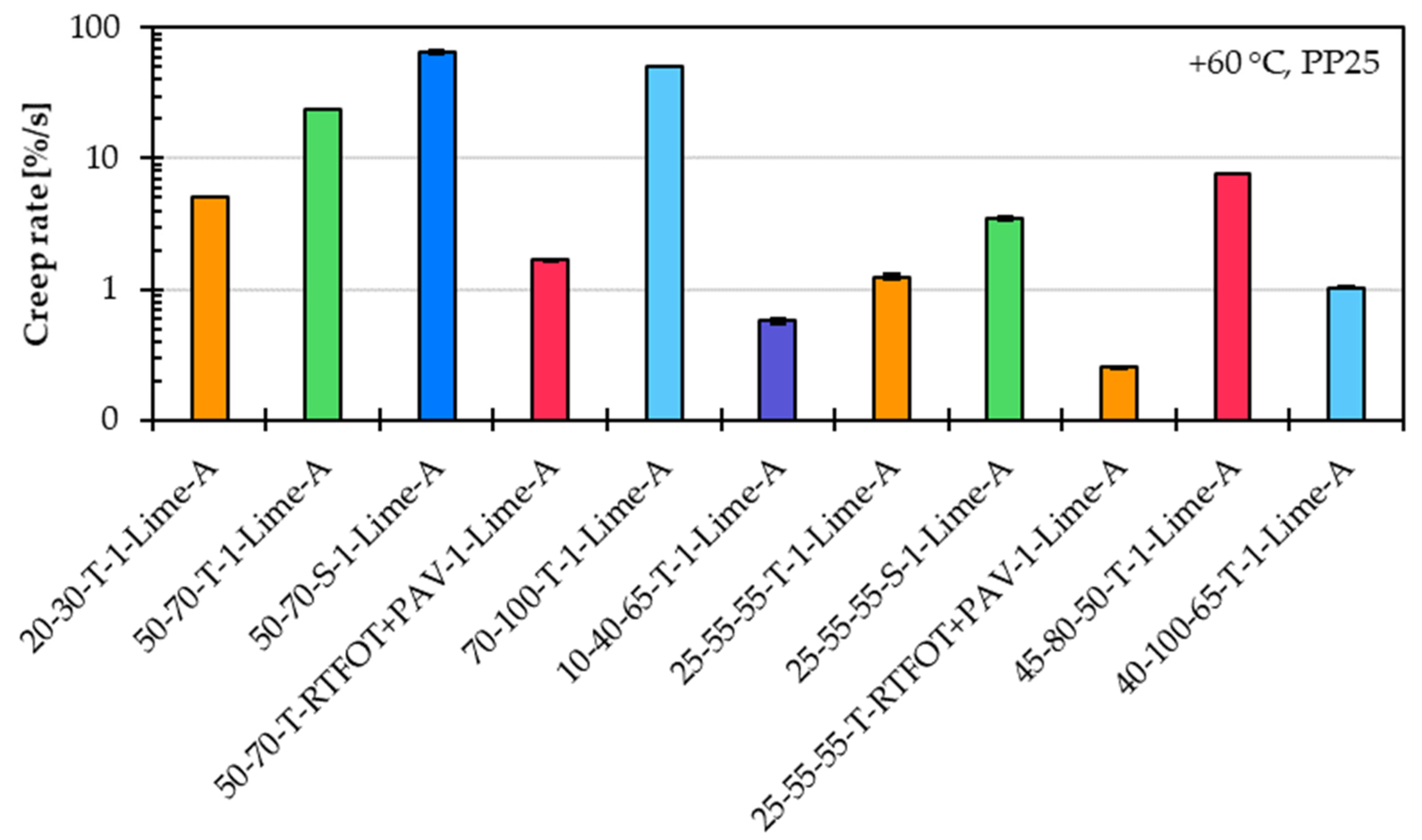 The creep rate results clearly demonstrate that the type of asphalt binder has a significant influence on the high-temperature performance of the asphalt mastic. Notably, considerable differences in performance are also observed among asphalt mastic variants prepared with the same asphalt binder grade but sourced from different manufacturers. Furthermore, the incorporation of a modified asphalt binder lead to a substantial reduction in creep rate, indicating enhanced resistance to permanent deformation. Asphalt mastic variants containing a long-term aged asphalt binder showed clearly lower creep rates as well, reflecting increased stiffness and reduced susceptibility to creep under stress at high temperature.