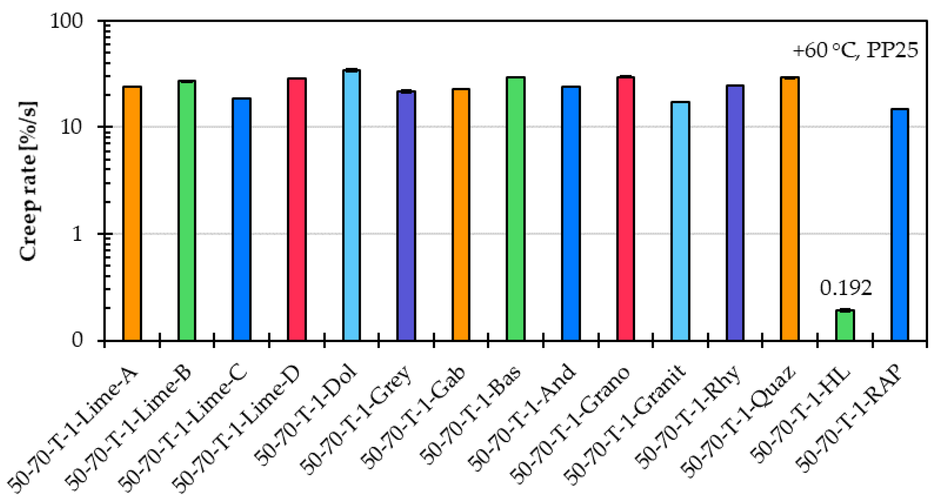 Figure 6 shows in a logarithmic scale the creep rate values for fifteen asphalt mastic variants prepared with unmodified asphalt binder 50/70 (T), a constant f/b ratio of 1, and fifteen different filler types, as described in
