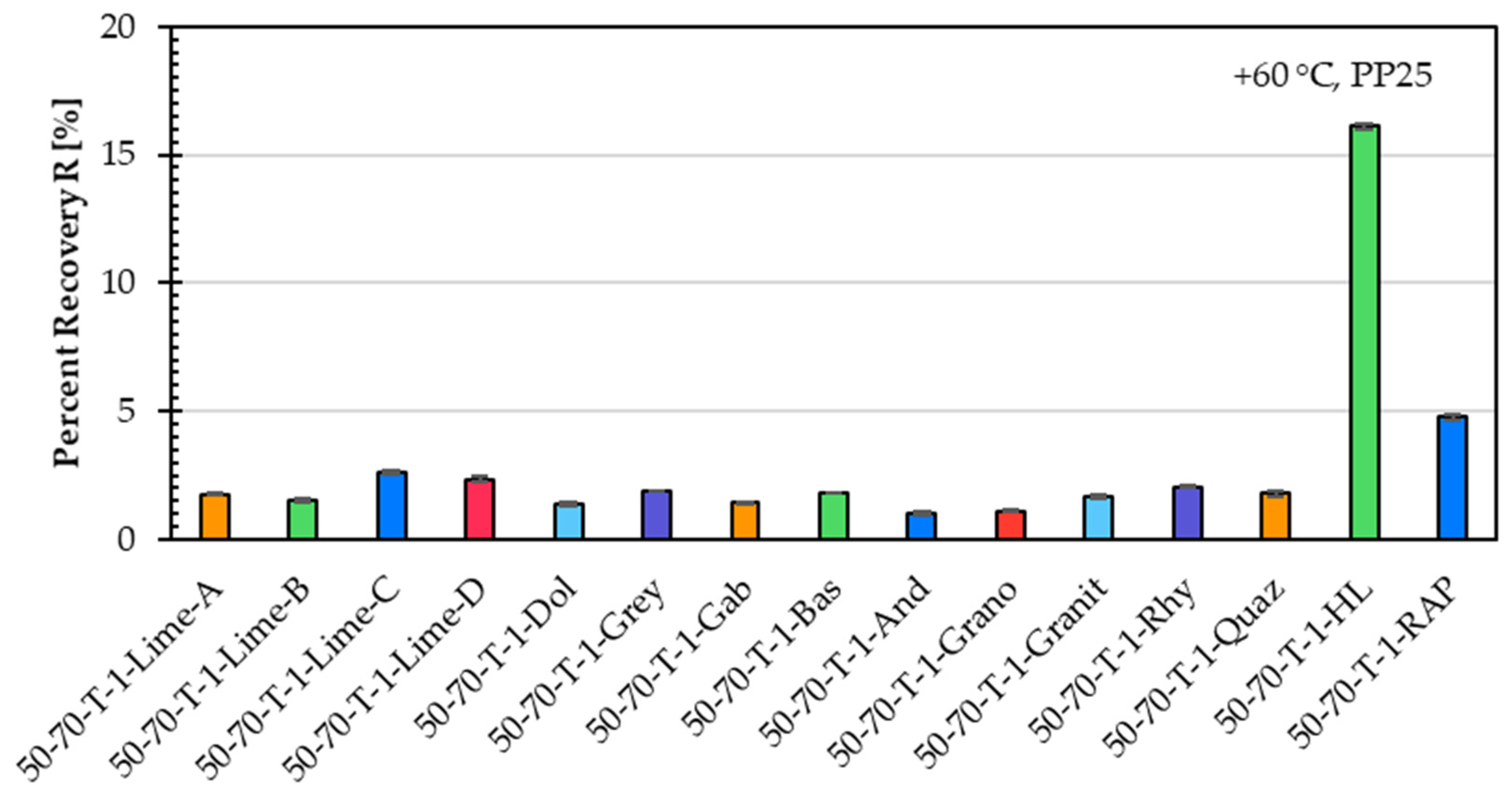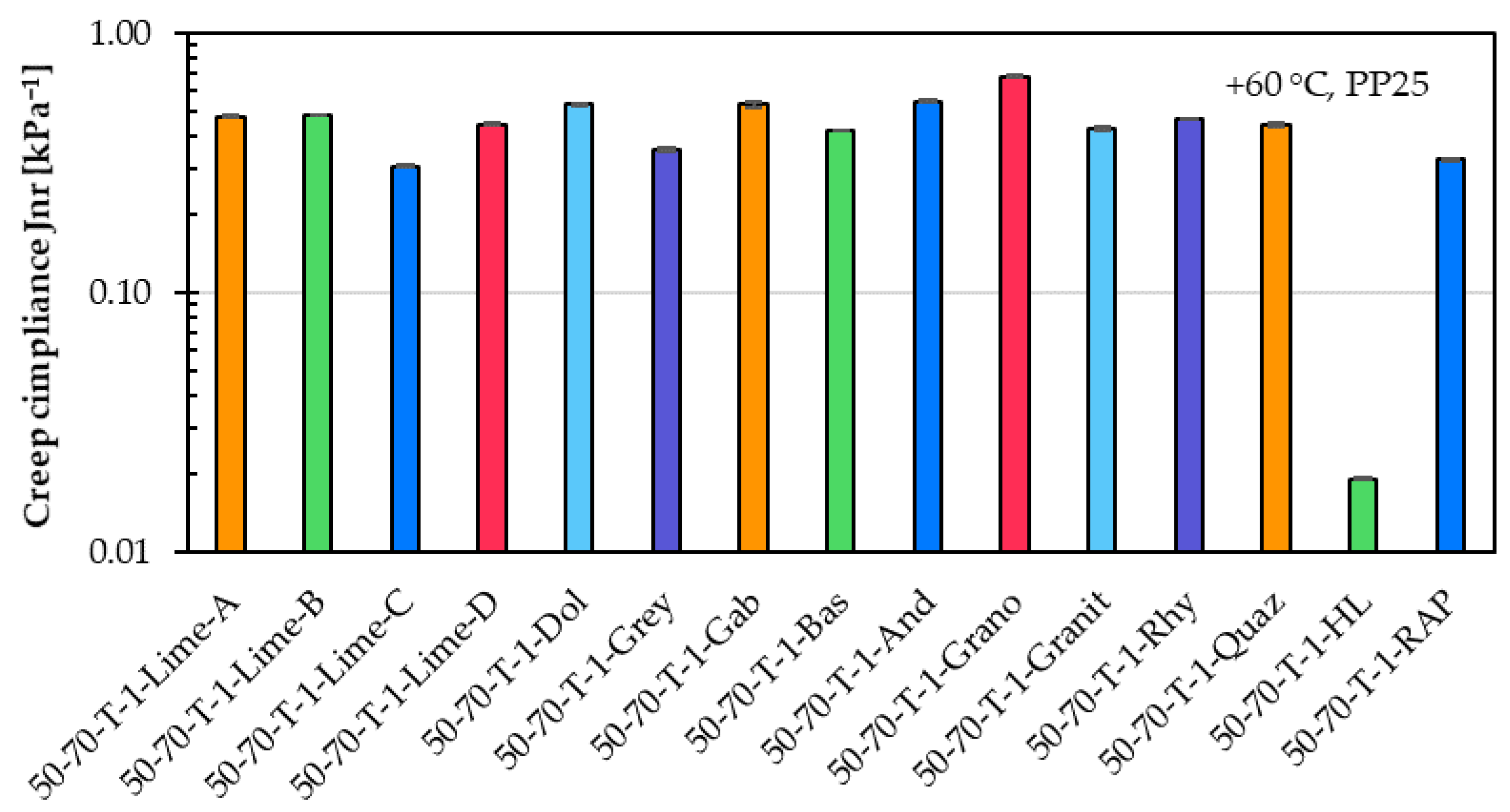 Similar to the creep rate results, the percent recovery and creep compliance results further confirm that the asphalt binder type has a significant influence on the high-temperature performance of the asphalt mastic. The percent recovery values clearly distinguish between the mastic variants made with unmodified and modified asphalt binder types. Asphalt mastics with unmodified binders, such as 20/30-T-1-Lime-A and 50/70-T-1-Lime-A, exhibited low percent recovery values in the range of only a few percent. Even negative recovery is observed in variants containing softer unmodified binders, such as 50/70-S-1-Lime-A and 70/100-T-1-Lime-A, indicating poor elastic response. These findings further support the notion that the MSCR test is not well suited for evaluating a unmodified asphalt binder or asphalt mastic variants based on such an asphalt binder. In contrast, asphalt mastic variants incorporating long-term aged asphalt binder types (e.g., 50/70-T-RTFOT+PAV-1-Lime-A and 25/55-55-T-RTFOT+PAV-1-Lime-A) showed improved percent recovery, suggesting that oxidative aging increases the elastic response and contributes positively to recovery performance.