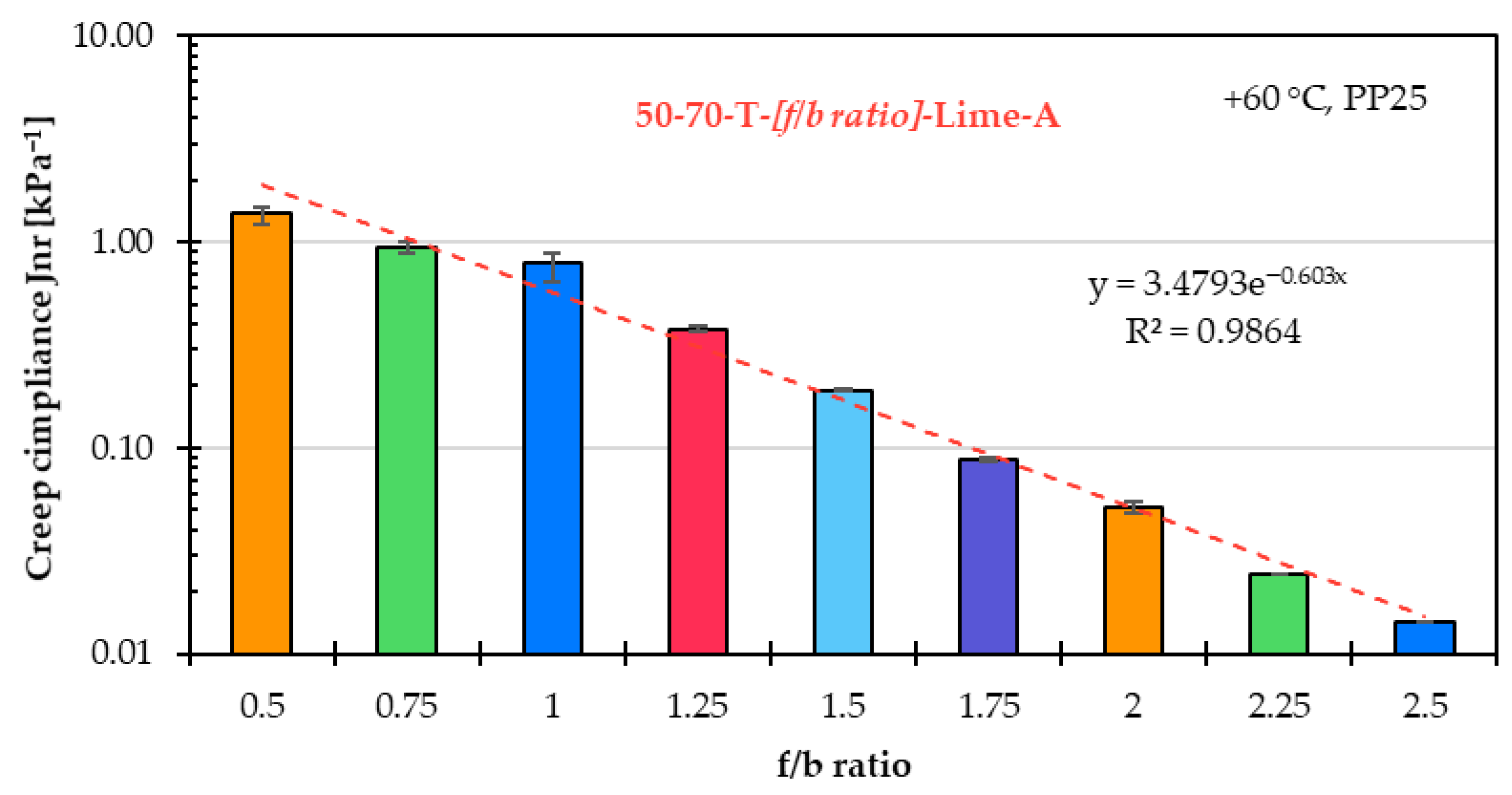 Figure 9 shows the creep rates in the logarithmic scale of asphalt mastic variants prepared with unmodified asphalt binder 50/70 (T) and limestone filler A, covering f/b ratios from 0.5 to 2.5. The correlation between the f/b ratio and creep rate can be well approximated by a linear curve when the creep rate is plotted on a logarithmic scale. The marked decrease in creep rate illustrates the substantial stiffening effect associated with increasing the f/b ratio. Based on these results, it can be concluded that the f/b ratio has a strong influence on the high-temperature performance of asphalt mastic.