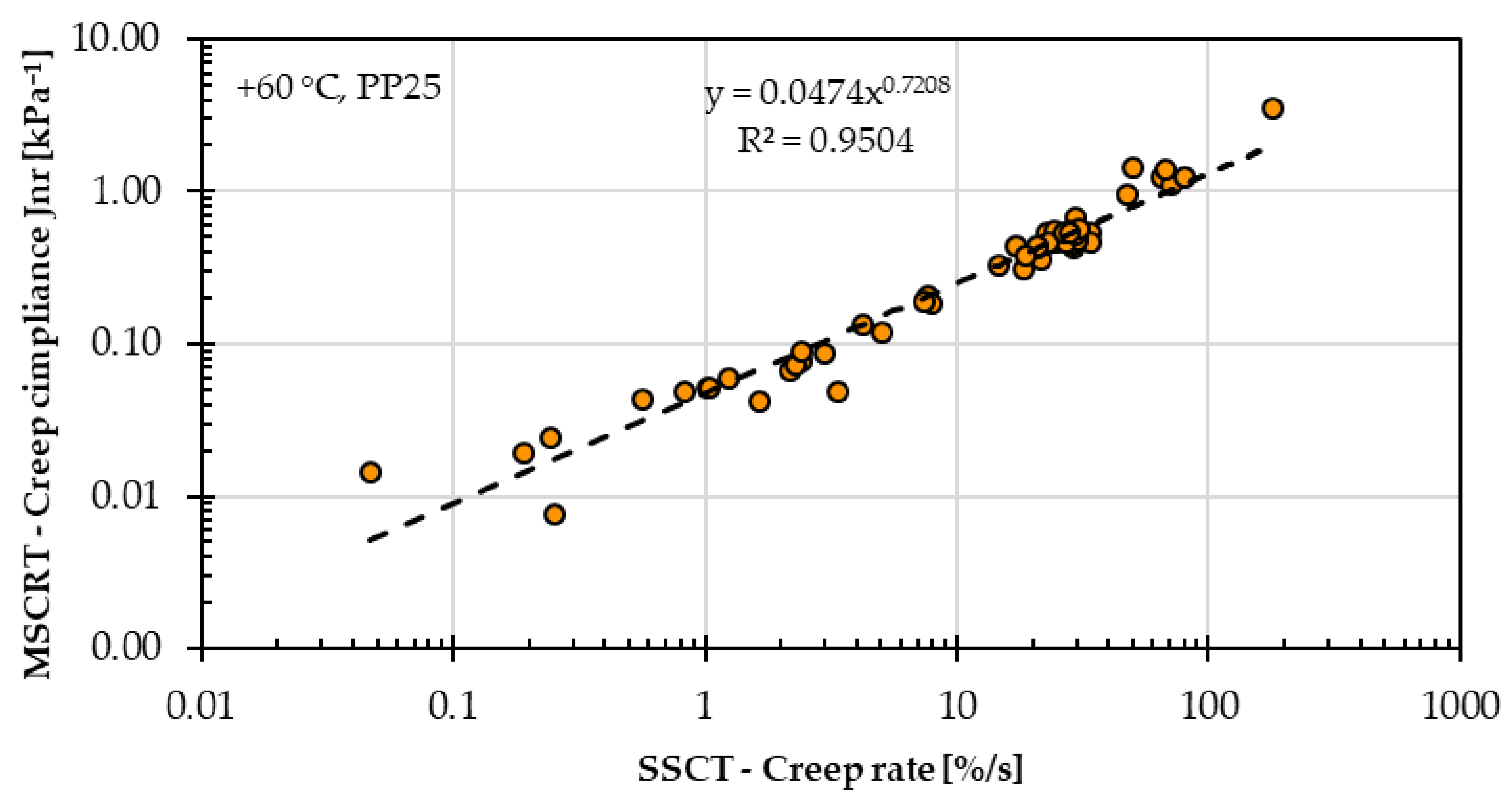 Figure 15 shows the creep compliance values from the MSCRT and the creep rate values from the SSCT at 60 °C for all 45 asphalt mastic variants evaluated in this study. A clear linear correlation is observed between creep compliance and creep rate when both parameters are plotted on a logarithmic scale. A strong linear relationship was observed between these two parameters (R