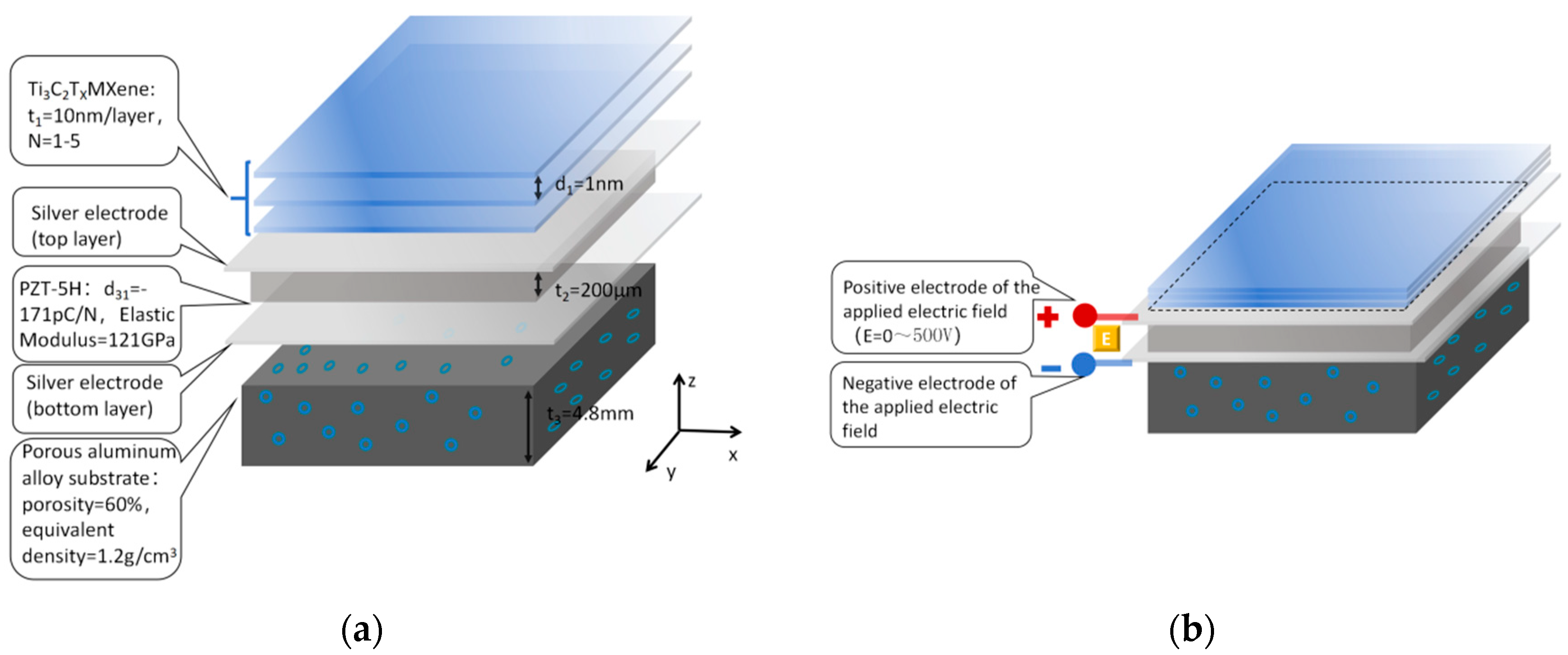 x MXene layer, a silver electrode (top layer), a PZT-5H piezoelectric ceramic layer, a silver electrode (bottom layer), and a porous aluminum alloy substrate (