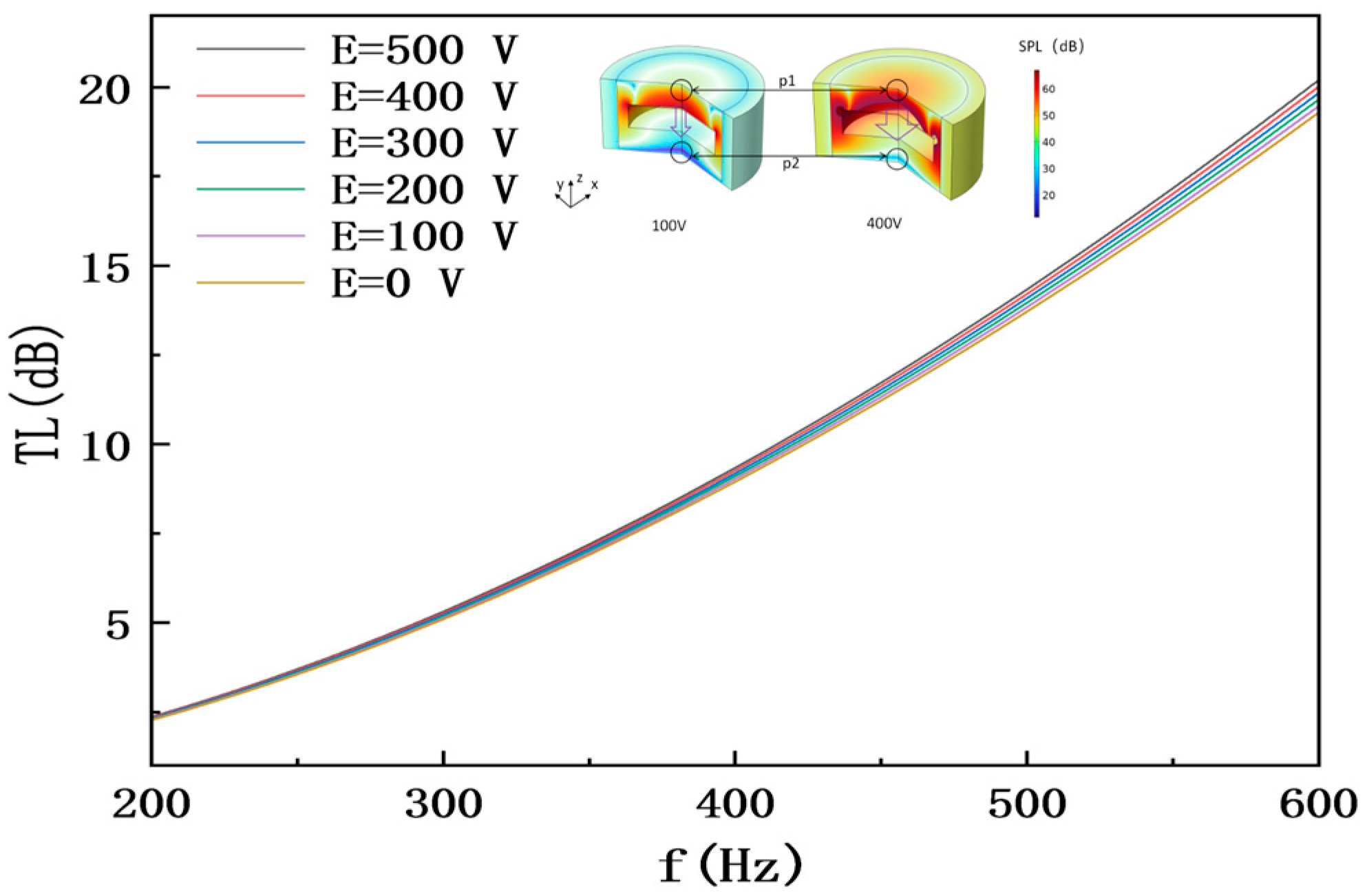 The abscissa is frequency f (200–600 Hz), and the ordinate is transmission loss TL (dB); the curves correspond to external electric field intensities E = 0 V, 100 V, 200 V, 300 V, 400 V, and 500 V, respectively, with key data marked as follows: at E = 0 V, the curve shows a gently increasing trend in the 200–600 Hz band (TL = 2.36534 dB at 200 Hz, TL = 20.19948 dB at 600 Hz); at E = 500 V, the average TL of this band is 3.8 dB higher than that at E = 0 V, and the improvement is more significant in the mid-high frequency band (300–600 Hz) (TL = 22.26975 dB at 600 Hz, 2.07027 dB higher than that at E = 0 V); under all electric field conditions, the curves have no obvious local peaks, reflecting the broadband sound insulation characteristic. Moreover, the larger the E, the more significantly the TL curve shifts upward overall, verifying the effectiveness of external electric field in regulating sound insulation performance.