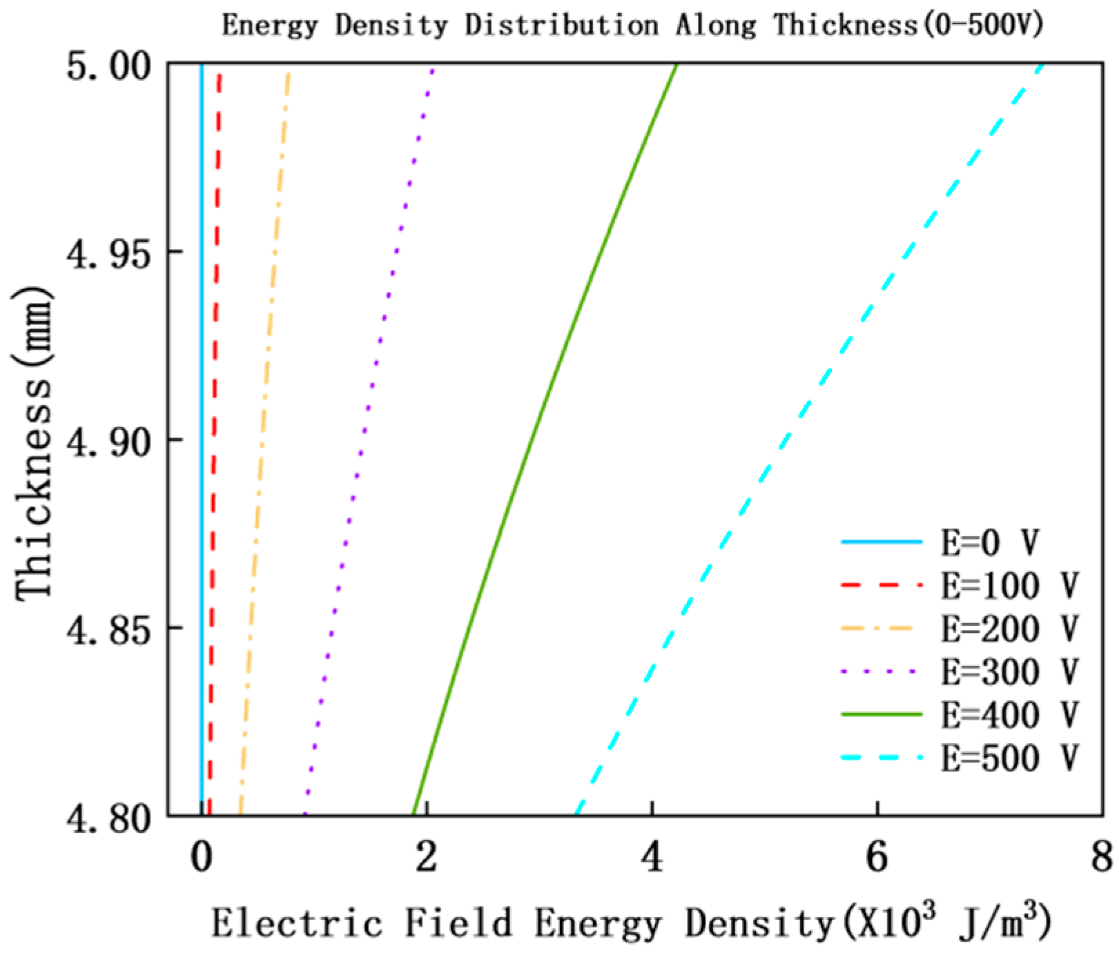 The abscissa is electric field energy density We (×103 J/m3), and the ordinate is structural thickness (4.8–5 mm, corresponding to the overall thickness range of “MXene layer-PZT layer”); the different curves correspond to external electric field intensities E = 0 V, 100 V, 200 V, 300 V, 400 V, and 500 V, respectively, with key characteristics marked as follows: We shows a distribution trend of “high at the top layer and low at the bottom layer” along the structural thickness direction. The We at the top layer of PZT (MXene equivalent region) is significantly higher than that at the bottom layer, reflecting the high dielectric energy storage characteristic of MXene; at E = 0 V, the We at the top layer is approximately 0 J/m3, and it increases to 7.47056 × 103 J/m3 at E = 500 V. We increases linearly with the increase in E, indicating that the electric field energy storage capacity of MXene is significantly improved, providing an energy foundation for the conversion of dielectric loss to structural damping.