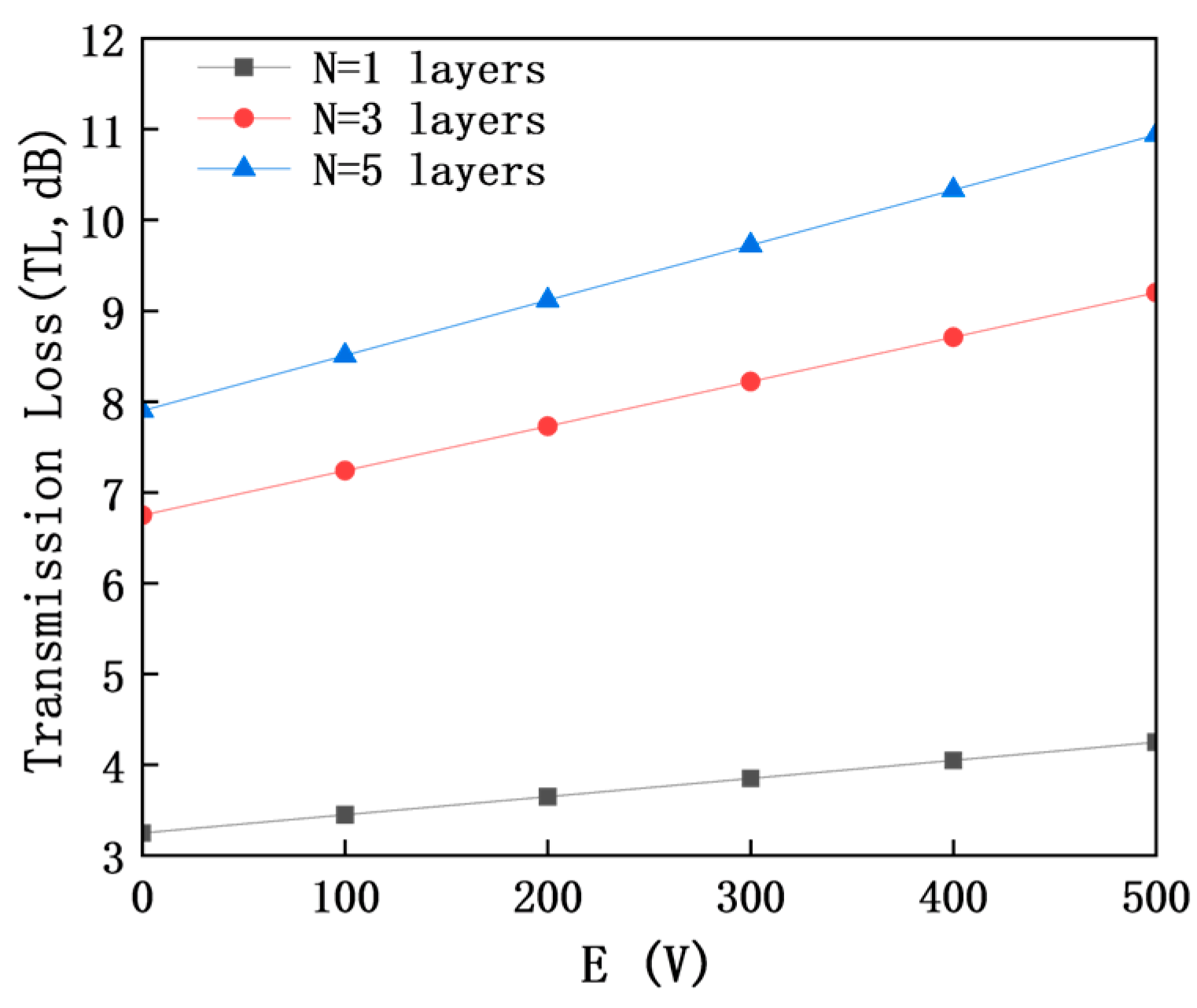 E (0–500 V), and the ordinate is transmission loss