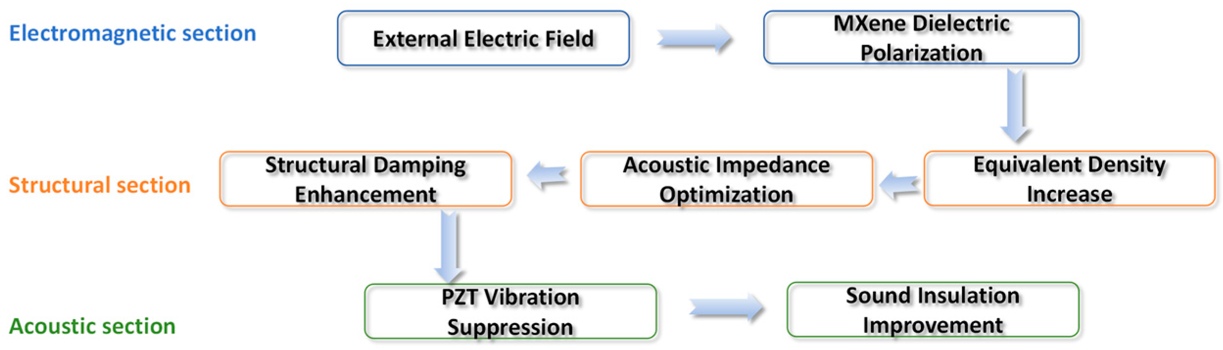 This study’s core innovations are as follows: (1) it is the first to combine MXene’s dielectric tunability with piezoelectric metamaterials, constructing a synergistic system of “active regulation–passive sound insulation” to break through the mass law limitation at the subwavelength scale; (2) a cross-field coupling framework of “dielectric regulation-density optimization–impedance matching-sound insulation enhancement” is established, filling the theoretical gap of MXene’s coupling mechanism in subwavelength sound insulation; (3) the quantitative regulation laws of MXene layer number (N = 3 as optimal) and external electric field (0–500 V) are clarified, providing direct engineering references for structural optimization.