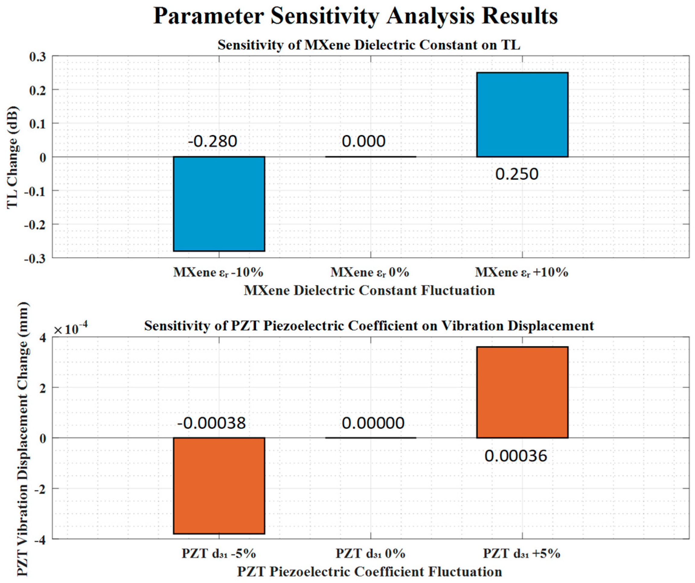 To verify the stability of the simulation results, parameter sensitivity analysis was performed by varying key parameters within a reasonable range (±10% for MXene’s dielectric constant, ±5% for PZT’s piezoelectric coefficient