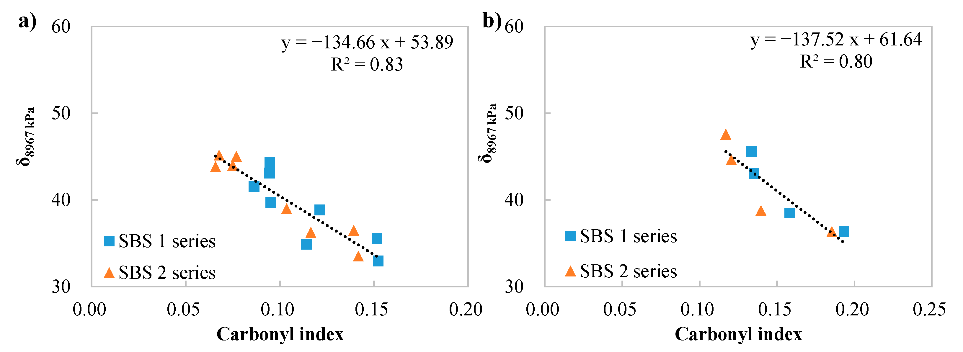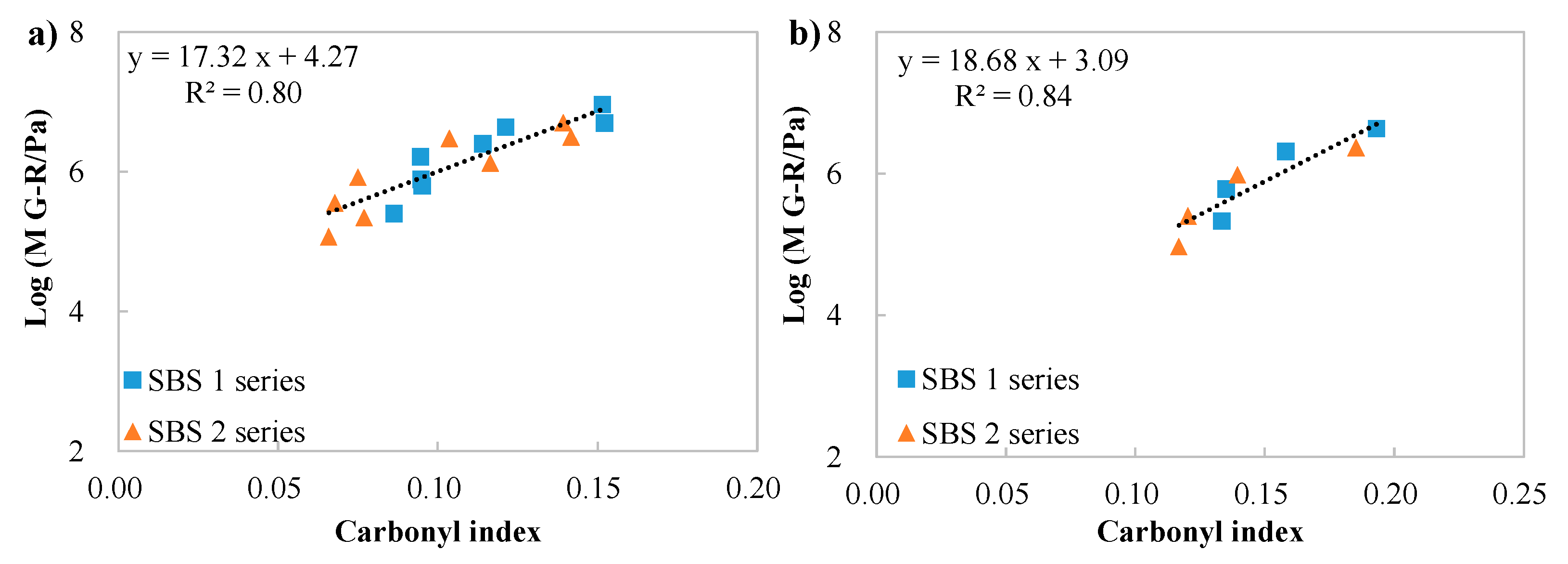 3.6. Correlations Between Chemical and Rheological Indices of Binders